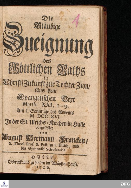 Die Gläubige Zueignung des Göttlichen Raths in Christi Zukunft zur Tochter Zion / Aus dem Evangelischen Text Matth.XXI, 1--9. Am 1.Sonntage des Advents MDCCXVI. In der St.Ulrichs=Kirchen in Halle vorgestellet von August Hermann Francken / S.Theol.Prof.& Past.zu S.Ulrich, und des Gymnasii Scholarcha. HALLE, Gedruckt und zu finden im Wäysen=Hause. 1716.