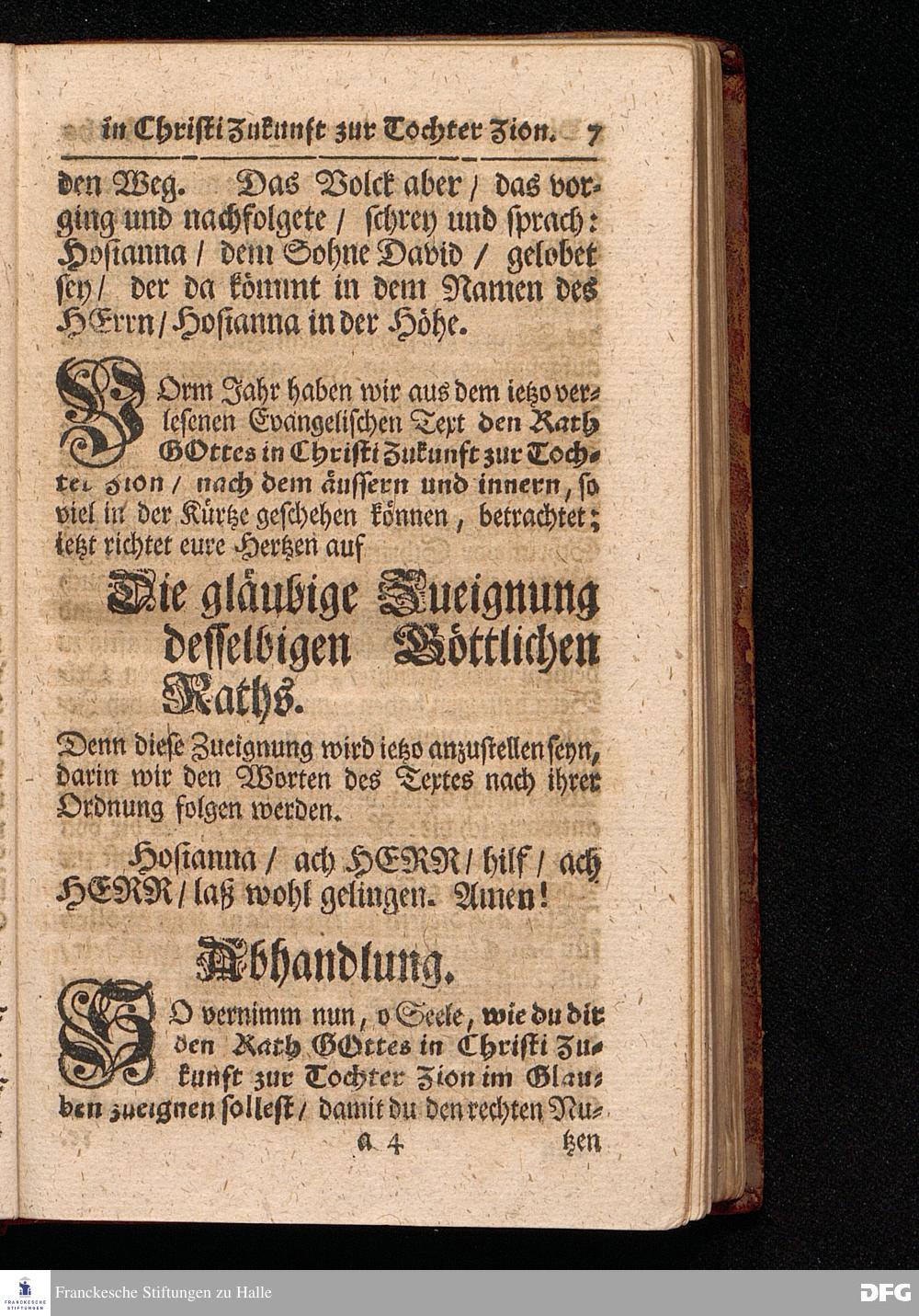 Die Gläubige Zueignung des Göttlichen Raths in Christi Zukunft zur Tochter Zion / Aus dem Evangelischen Text Matth.XXI, 1--9. Am 1.Sonntage des Advents MDCCXVI. In der St.Ulrichs=Kirchen in Halle vorgestellet von August Hermann Francken / S.Theol.Prof.& Past.zu S.Ulrich, und des Gymnasii Scholarcha. HALLE, Gedruckt und zu finden im Wäysen=Hause. 1716.