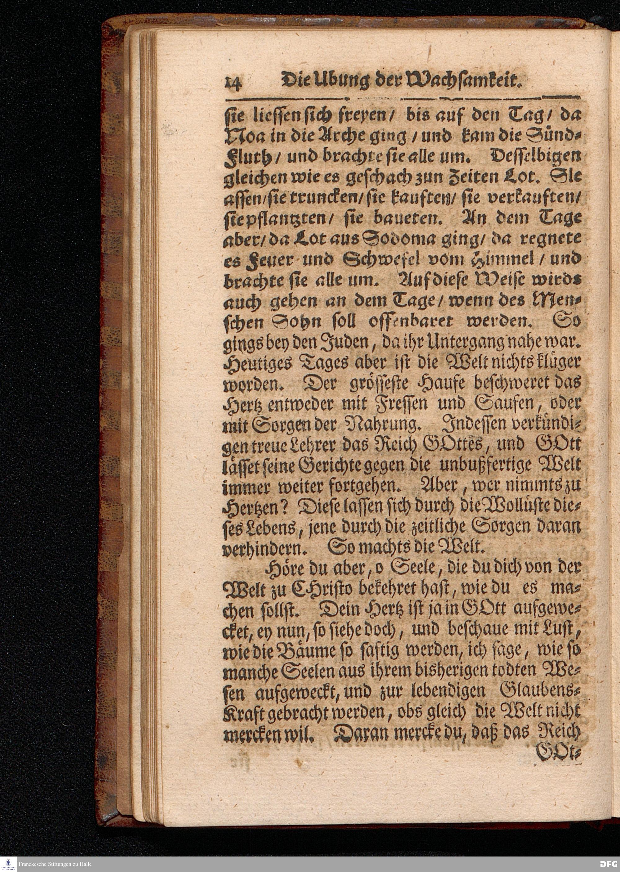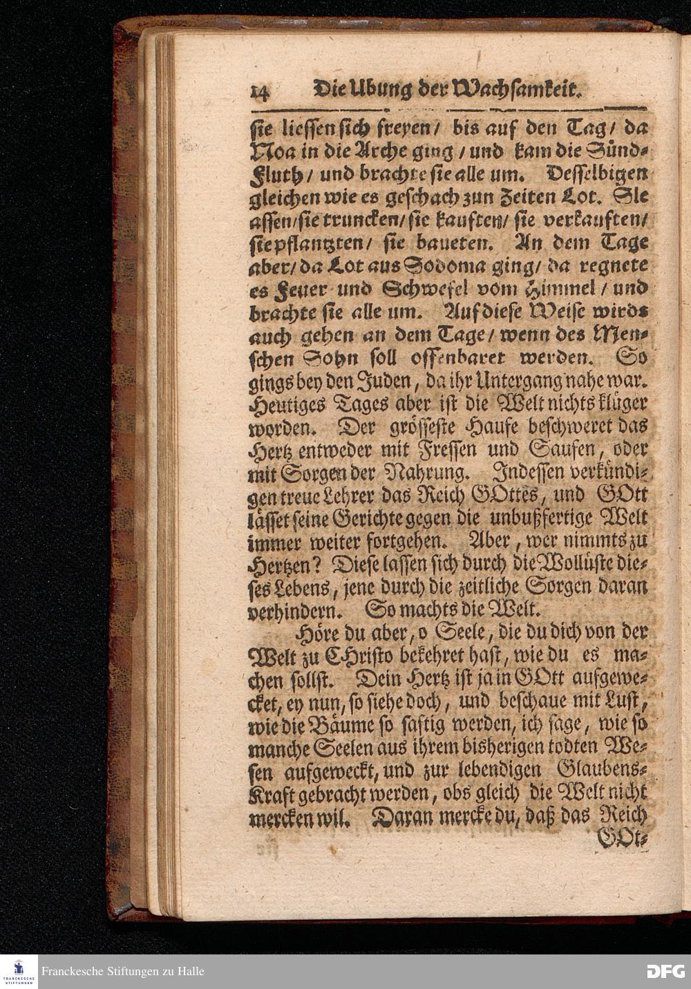 Die Ubung Der Wachsamkeit / Aus dem Evangelischen Text Luc.XXI, 25-36. Am II.Sonntage des Advents MDCCXVI. In der St.Ulrichs=Kirchen in Halle vorgestellet von August Hermann Francken / S.Theol.Prof.& Past.zu S.Ulrich, und des Gymnasii Scholarcha. HALLE, Gedruckt und zu finden im Wäysen=Hause, 1716.