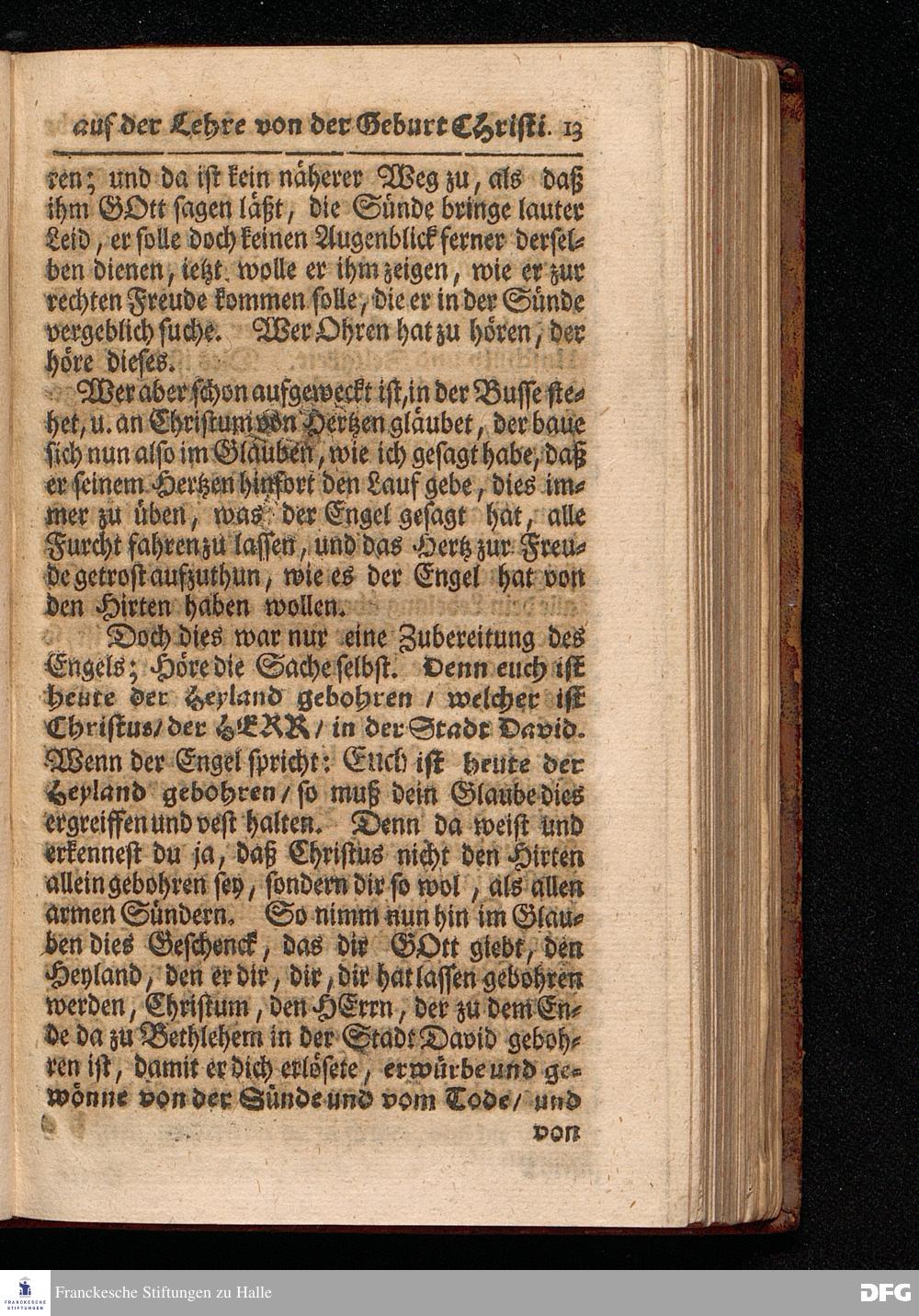 Der Bau des Glaubens / der Hoffnung und der Liebe auf der Grund=Lehre von der Geburt unsers HERRN JEsu CHristi / Aus dem Evangelischen Text Luc.II, 1--14. Am I.Weyhnachts=Feyer=Tage MDCCXVI. In der St.Ulrichs=Kirchen in Halle vorgestellet von August Hermann Francken / S.Theol.Prof.& Past.zu S.Ulrich, und des Gymnasii Scholarcha. HALLE, Gedruckt und zu finden im Wäysen=Hause. 1717.