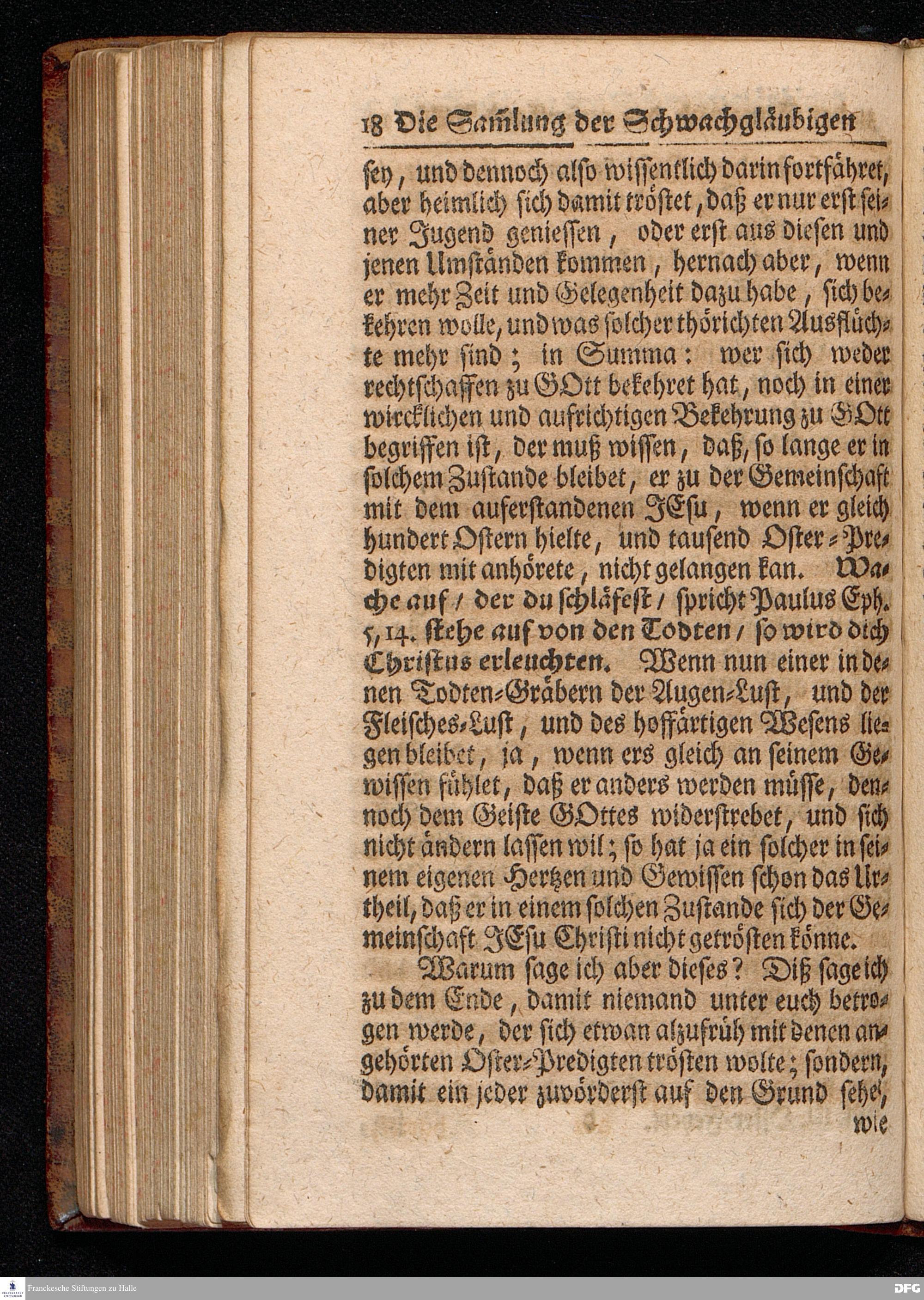 Die Sa\-mlung der Schwachgläubigen zu der Gemeinschaft des auferstandenen JESU / Aus dem Evangelischen Text Luc.XXIV, 36--47. Am III.Oster=Feyertage MDCCXVII. In der St.Ulrichs=Kirchen in Halle vorgestellet von August Hermann Francken / S.Theol.Prof.& Past.zu S.Ulrich, und des Gymnasii Scholarcha. HALLE, Gedruckt und zu finden im Wäysen=Hause, 1717.