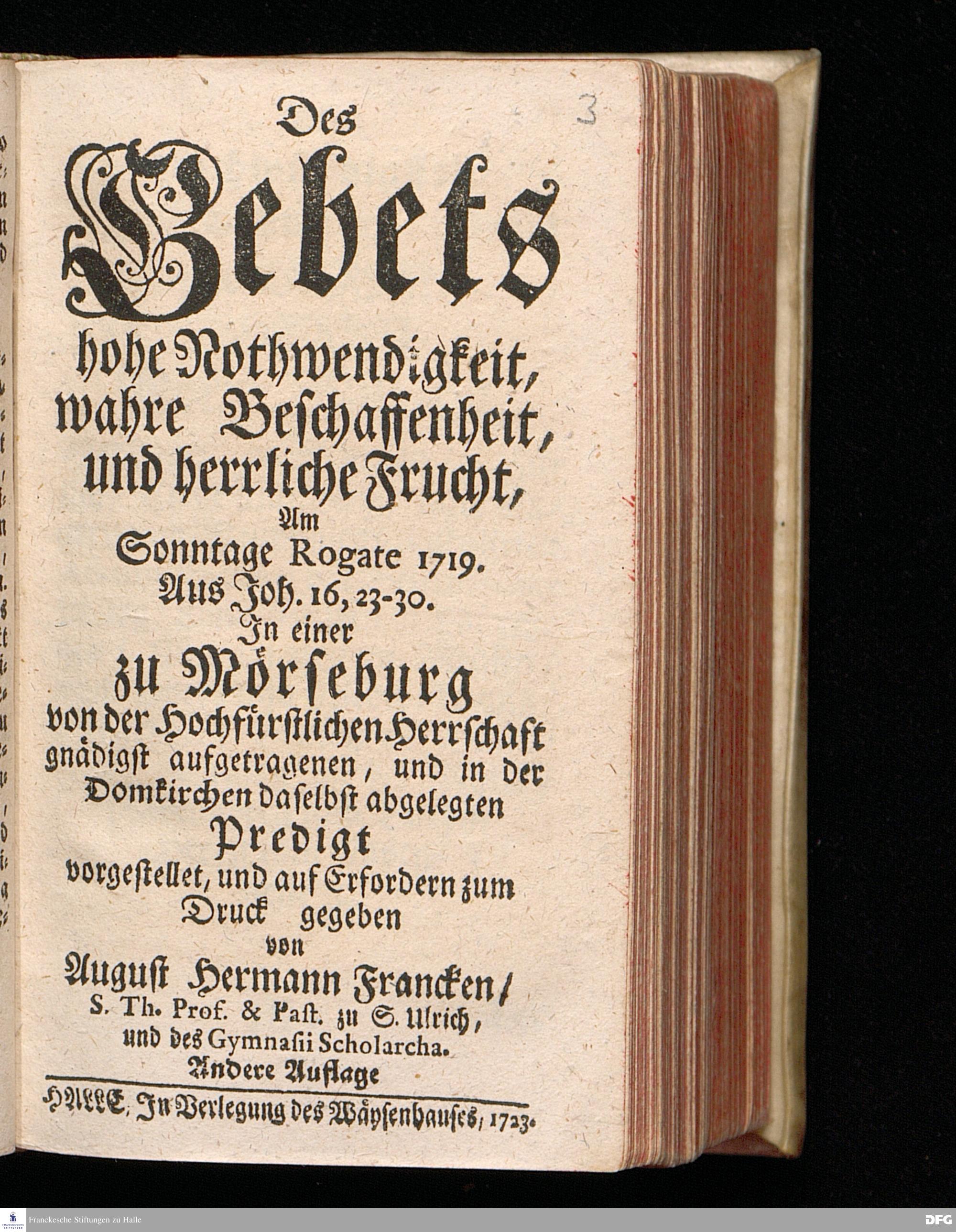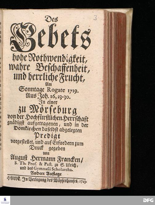 Des Gebets hohe Nothwendigkeit, wahre Beschaffenheit, und herrliche Frucht, Am Sonntage Rogate 1719. Aus Joh.16, 23-30. In einer zu Mörseburg von der Hochfürstlichen Herrschaft gnädigst aufgetragenen, und in der Domkirchen daselbst abgelegten Predigt vorgestellet, und auf Erfordern zum Druck gegeben von August Hermann Francken / S.Th.Prof.& Past.zu S.Ulrich, und des Gymnasii Scholarcha. Andere Auflage. HALLE In Verlegung des Wäysenhauses, 1723.