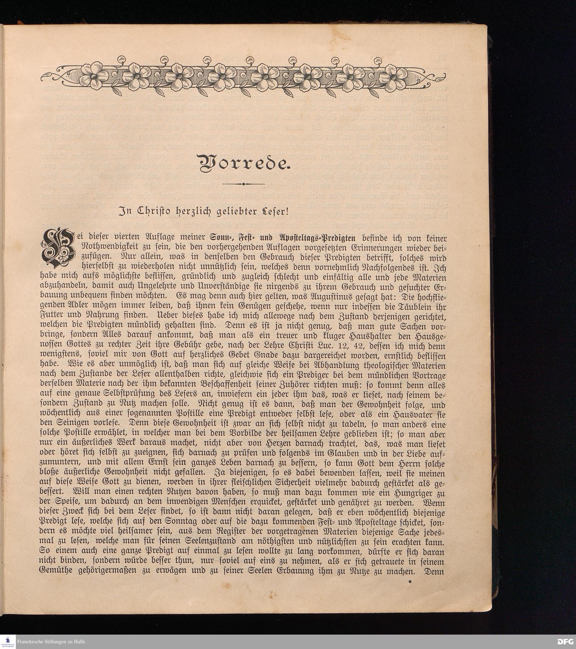 August Hermann Francke's weil.d.Theol.Prof.u.Pastor in Halle a.S., Sonn-, Fest- u. Aposteltags-Predigten, darinnen die zum wahren Christenthum gehörigen und vornehmsten Lehren behandelt sind. Aufs neue herausgegeben, verlegt und nur allein zu beziehen vom Ostpr.evang.Gebets=Verein in Berlin, Anklamstraße 31. Tilsit 1902. Gedruckt bei M. Jagomast.