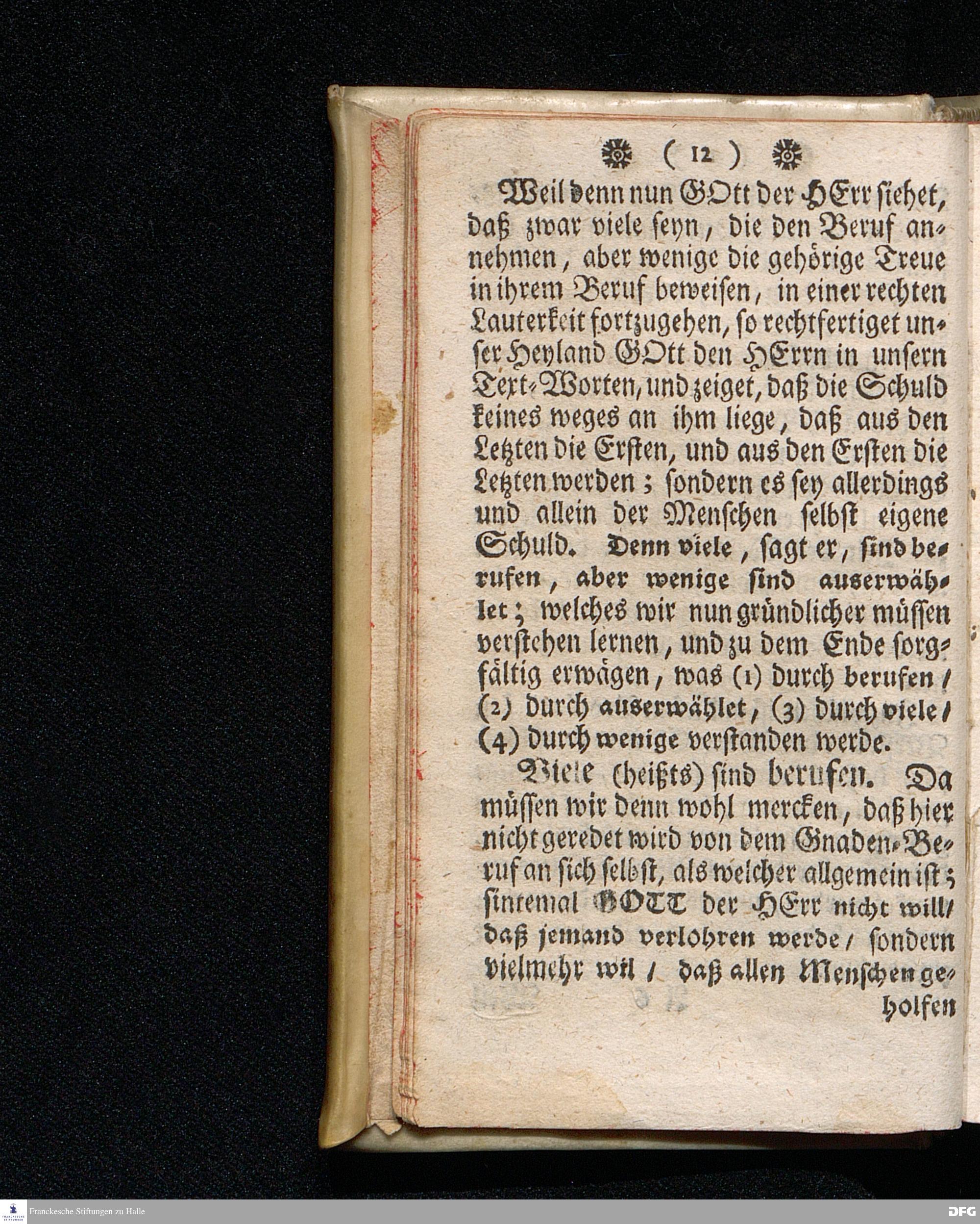 Erklärung des Spruchs Matth. 20 / 16. [Viele sind berufen / aber wenig sind auserwählet.] Auf dem Wäysen=Hause zu Glaucha An Halle Den 8.Jul.1711. ertheilet Von August Hermann Francken / S.Th.P.Ord.& Past.Glauch. Dritte Auflage. HALLE, In Verlegung des Wäysen=Hauses. MDCCXXIII.