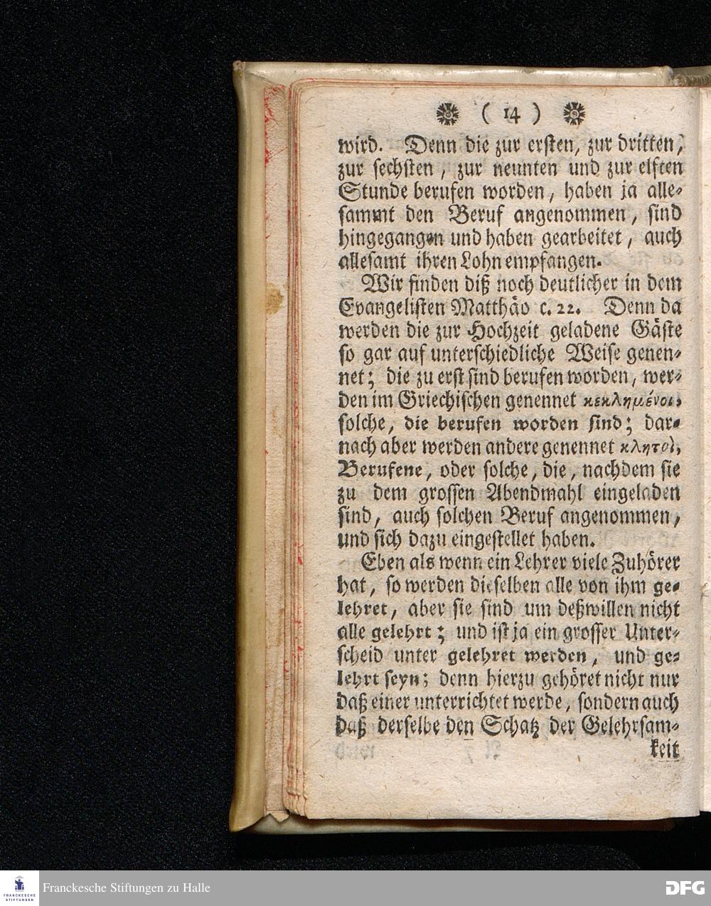 Erklärung des Spruchs Matth. 20 / 16. [Viele sind berufen / aber wenig sind auserwählet.] Auf dem Wäysen=Hause zu Glaucha An Halle Den 8.Jul.1711. ertheilet Von August Hermann Francken / S.Th.P.Ord.& Past.Glauch. Dritte Auflage. HALLE, In Verlegung des Wäysen=Hauses. MDCCXXIII.