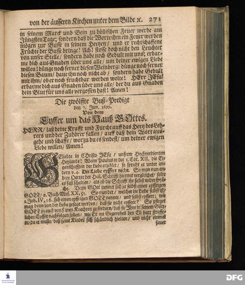Von dem Eyffer um das Haus GOttes. Die zwölffte Buß-Predigt den 7.Jun. 1699.
