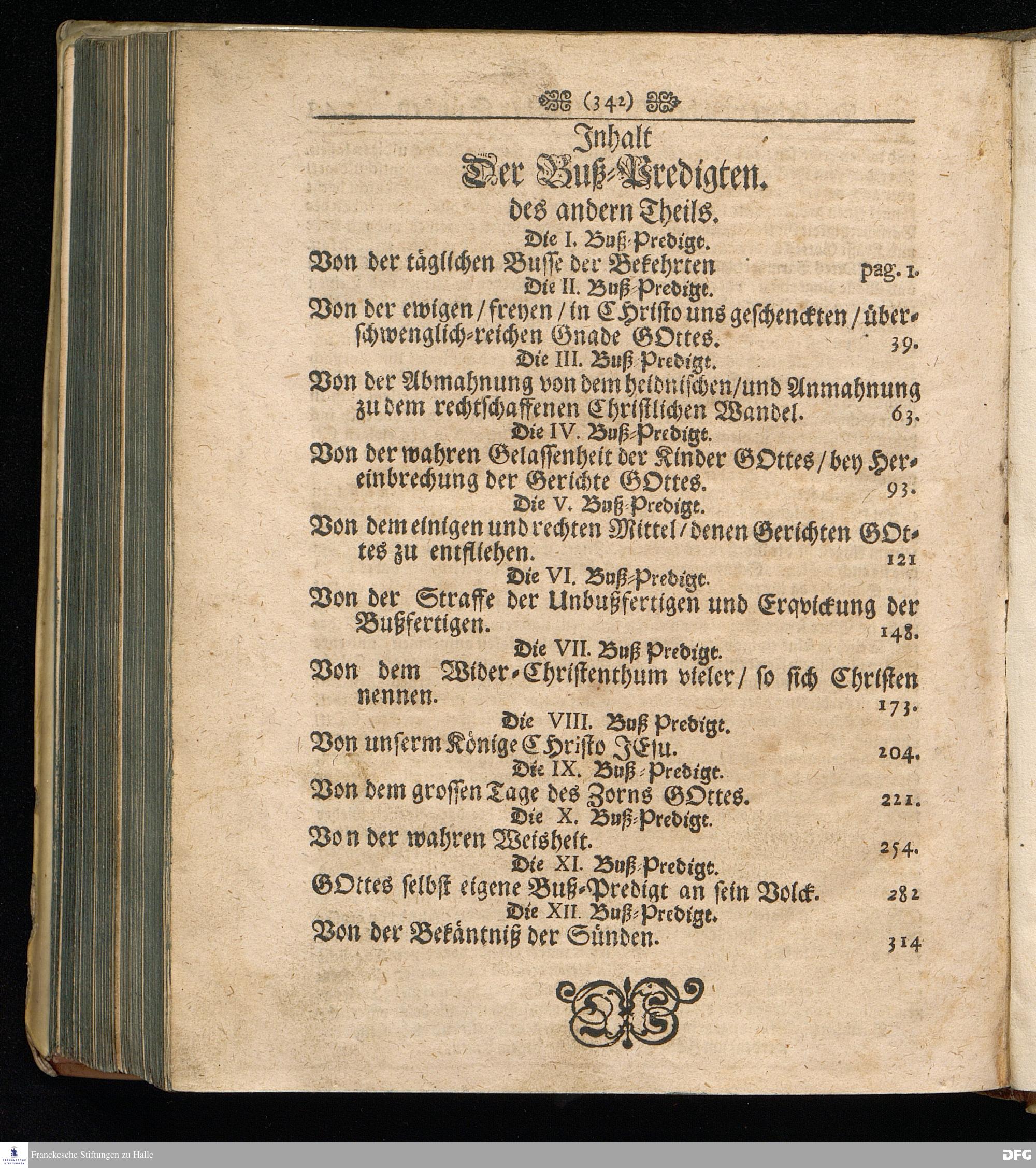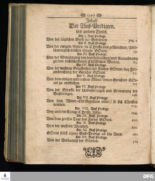 August Hermann Franckens SS. Theol. Prof. Ord. und Past. zu Glaucha/ Buß=Predigten/ Darinn Aus verschiedenen Texten H. Schrifft deutlich gezeiget wird/ Wie nicht nur Unbekehrte zur wahren Buße gelangen/ sondern auch die/ so bekehret sind/ in täglicher Buße und Gottseligkeit leben und wandeln sollen. Erster und Anderer Theil; Deren jener vor diesem schon ediret/ und nun auffs neue durchsehen und verbessert ist: dieser aber ietzo zum ersten mal heraus gegeben wird. Mit Königl. Preuß. und Churfl. Brandenb. Privilegio. HALLE/ in Verlegung des Wäysenhauses. MDCCVI