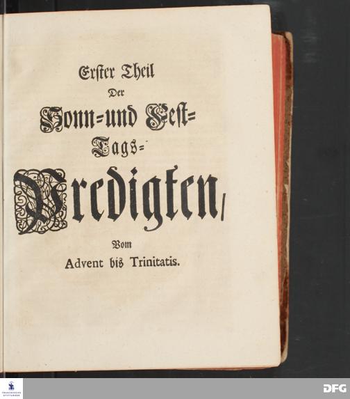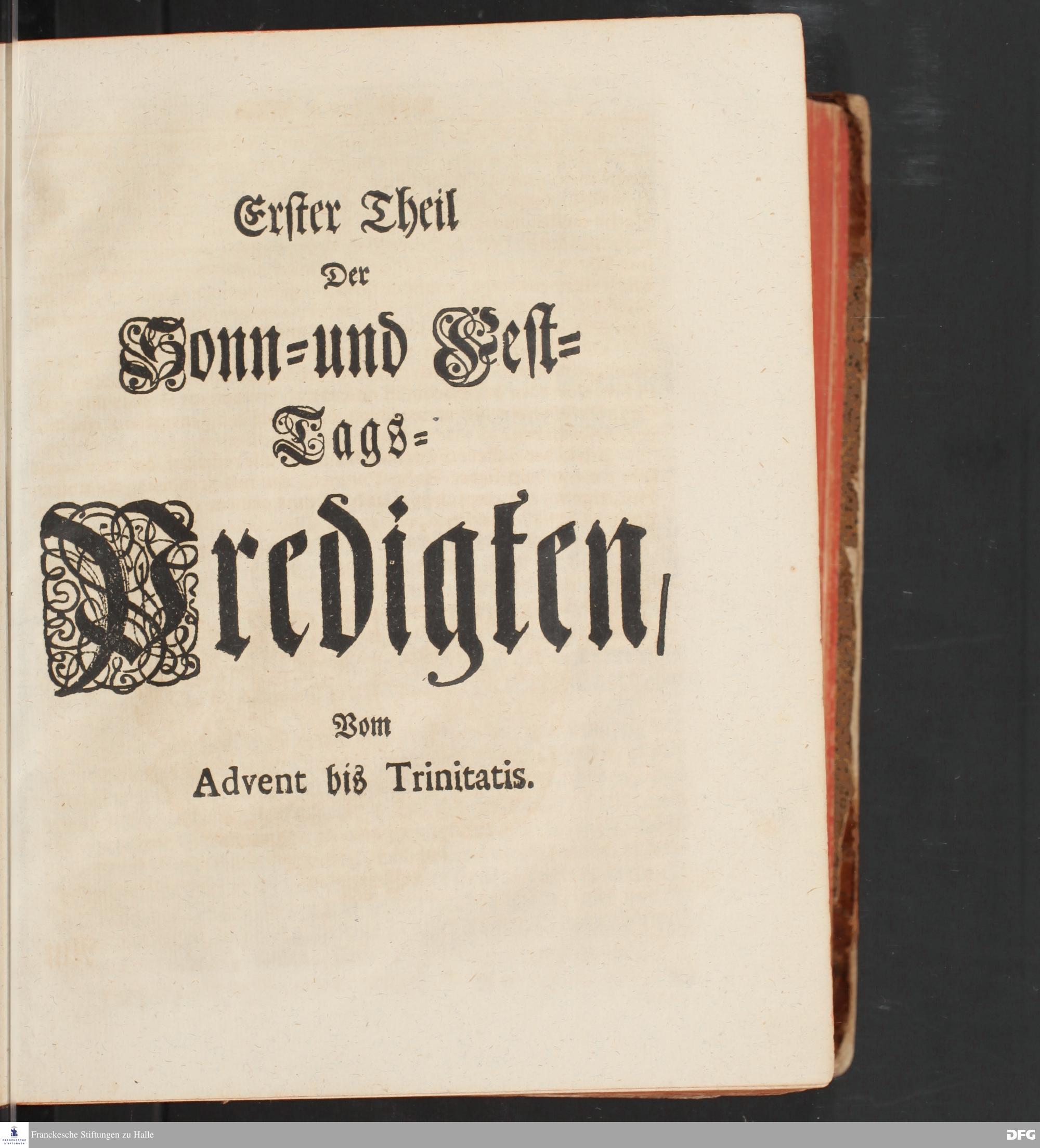 August Hermann Franckens, S.Theol.Prof.und Past. Sonn= und Fest=Tags=Predigten / Welche Theils in Halle, theils an verschiedenen auswärtigen Oertern, von wichtigen und auserlesenen Materien gehalten worden, Nebst Vorbereitung auf die hohen Feste und nützlichen Registern. Dritte Auflage. HALLE, gedruckt und verlegt im Wäysen=Hause MDCCXL. Mit Königl.Preuß.und Churfl.Brandenb.Privileg.