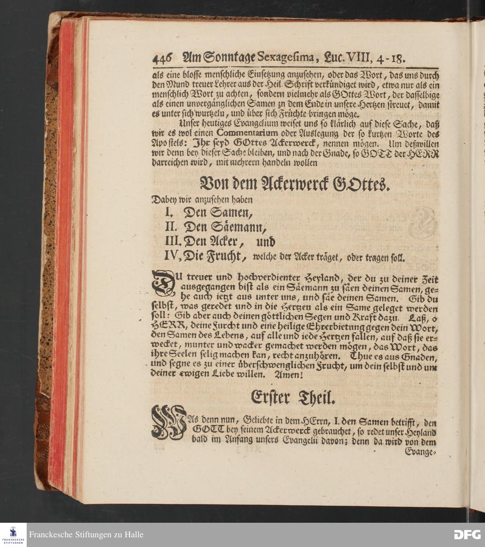 August Hermann Franckens, S.Theol.Prof.und Past. Sonn= und Fest=Tags=Predigten / Welche Theils in Halle, theils an verschiedenen auswärtigen Oertern, von wichtigen und auserlesenen Materien gehalten worden, Nebst Vorbereitung auf die hohen Feste und nützlichen Registern. Dritte Auflage. HALLE, gedruckt und verlegt im Wäysen=Hause MDCCXL. Mit Königl.Preuß.und Churfl.Brandenb.Privileg.