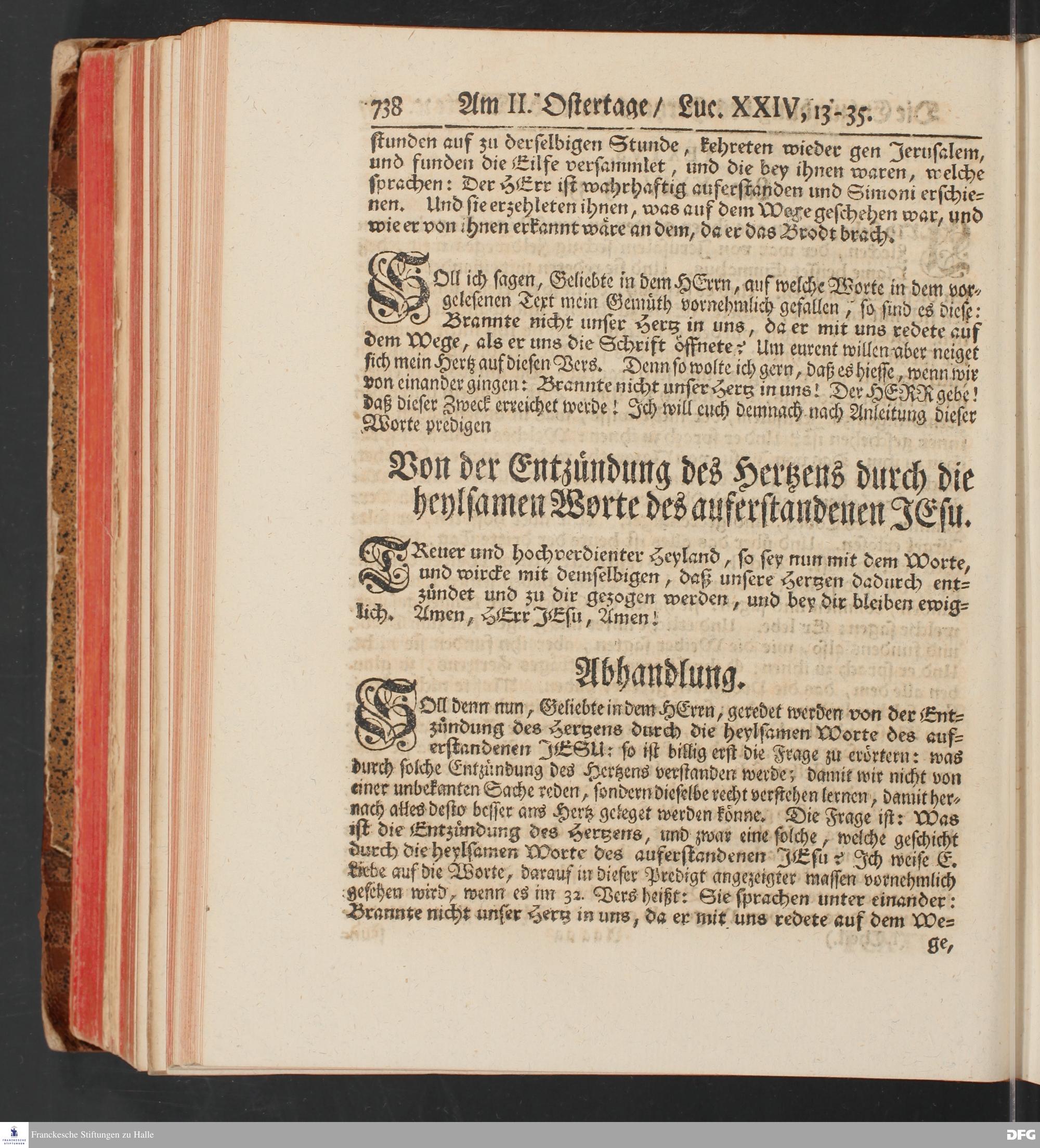 August Hermann Franckens, S.Theol.Prof.und Past. Sonn= und Fest=Tags=Predigten / Welche Theils in Halle, theils an verschiedenen auswärtigen Oertern, von wichtigen und auserlesenen Materien gehalten worden, Nebst Vorbereitung auf die hohen Feste und nützlichen Registern. Dritte Auflage. HALLE, gedruckt und verlegt im Wäysen=Hause MDCCXL. Mit Königl.Preuß.und Churfl.Brandenb.Privileg.