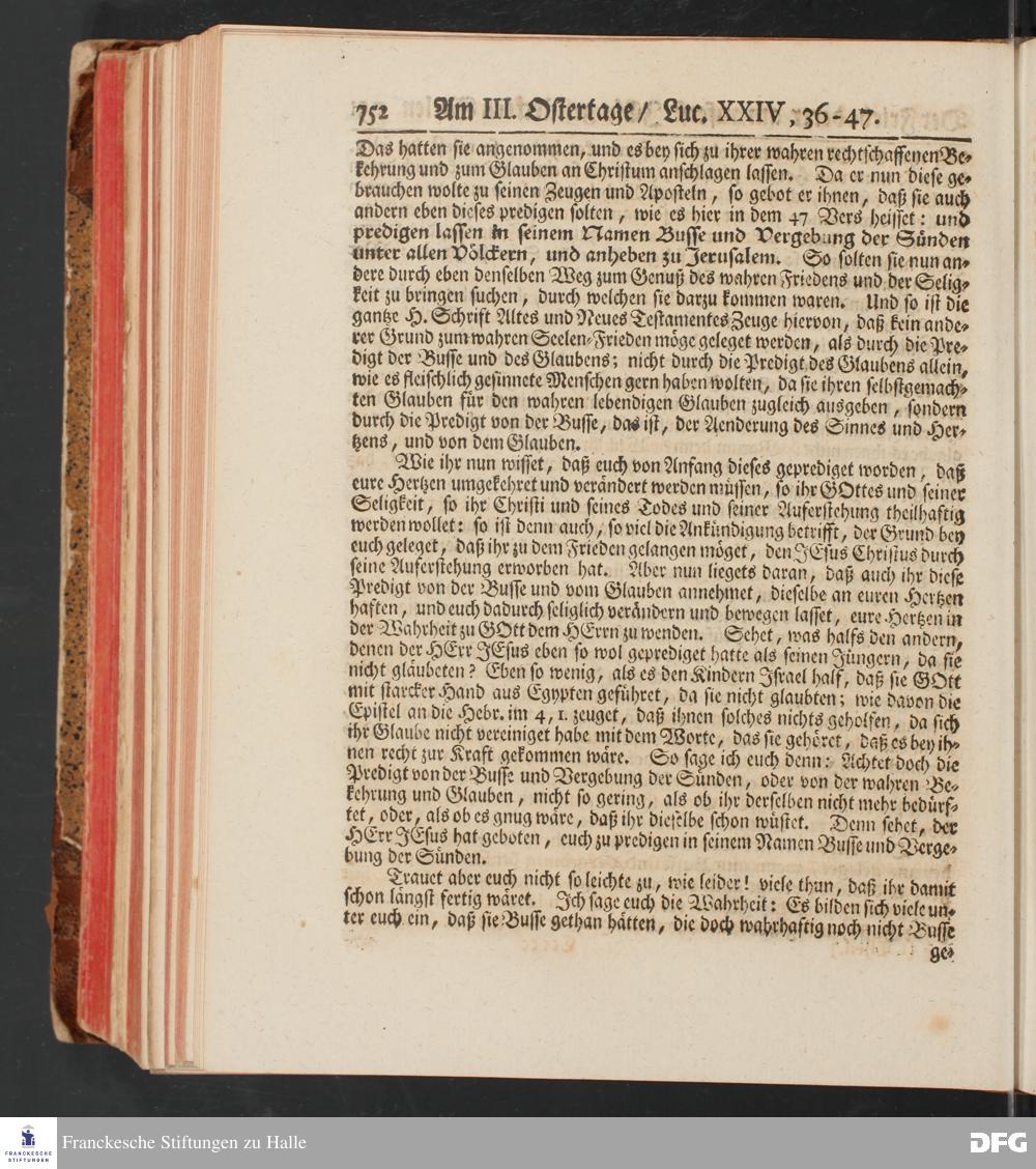 August Hermann Franckens, S.Theol.Prof.und Past. Sonn= und Fest=Tags=Predigten / Welche Theils in Halle, theils an verschiedenen auswärtigen Oertern, von wichtigen und auserlesenen Materien gehalten worden, Nebst Vorbereitung auf die hohen Feste und nützlichen Registern. Dritte Auflage. HALLE, gedruckt und verlegt im Wäysen=Hause MDCCXL. Mit Königl.Preuß.und Churfl.Brandenb.Privileg.