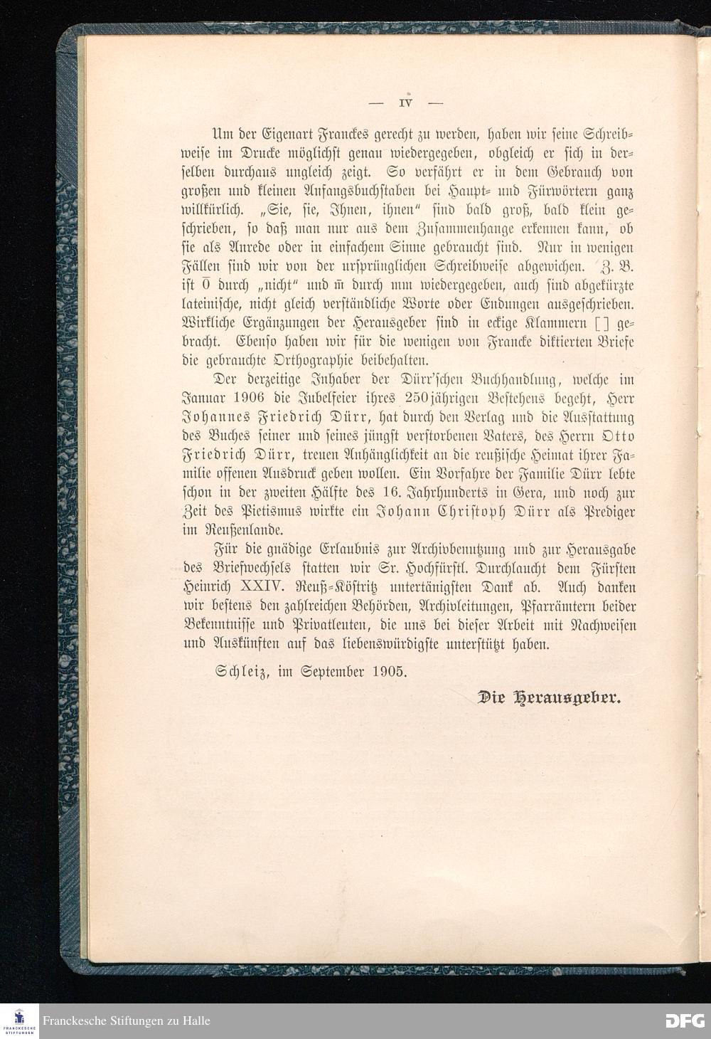A.H.Franckes Briefe an den Grafen Heinrich XXIV. j.L. Reuß zu Köstritz und seine Gemahlin Eleonore aus den Jahren 1704 bis 1727 als Beitrag zur Geschichte des Pietismus herausgegeben von Dr.Berthold Schmidt Fürstl.Reuß j.L.Archivrat und Lic.theol. Otto Meusel Gymnasialoberlehrer in Schleiz. Leipzig, Verlag der Dürr'schen Buchhandlung 1905.