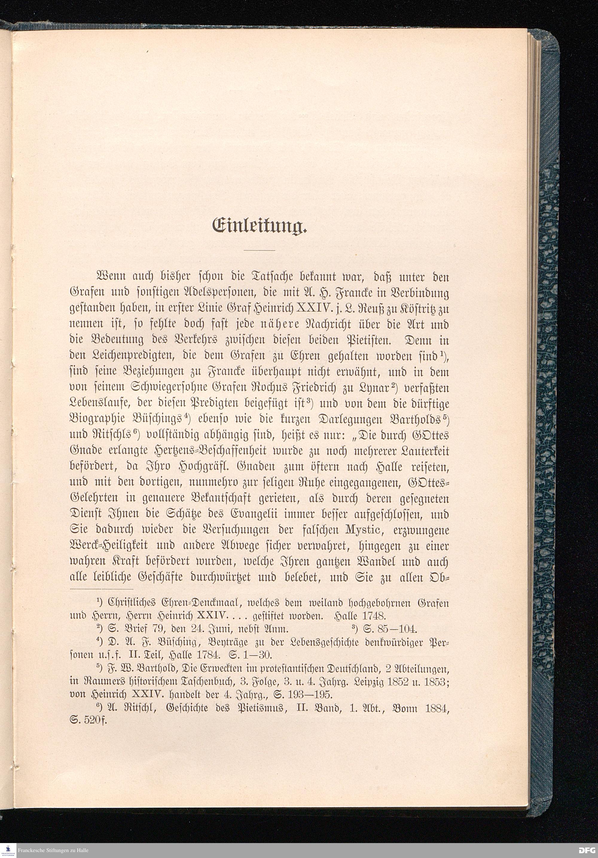 A.H.Franckes Briefe an den Grafen Heinrich XXIV. j.L. Reuß zu Köstritz und seine Gemahlin Eleonore aus den Jahren 1704 bis 1727 als Beitrag zur Geschichte des Pietismus herausgegeben von Dr.Berthold Schmidt Fürstl.Reuß j.L.Archivrat und Lic.theol. Otto Meusel Gymnasialoberlehrer in Schleiz. Leipzig, Verlag der Dürr'schen Buchhandlung 1905.