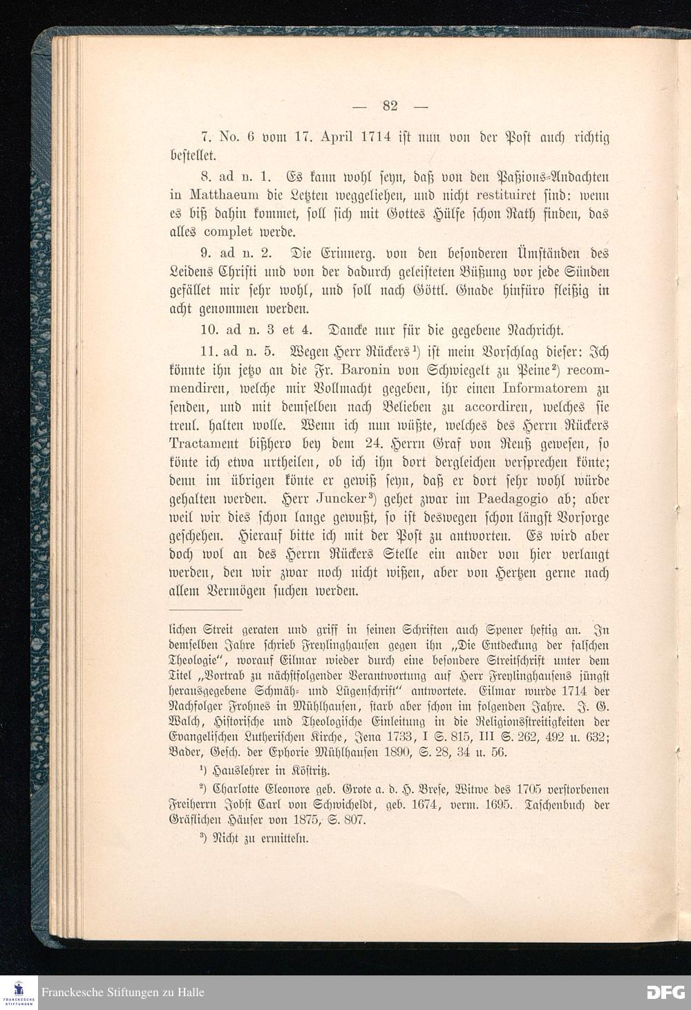 A.H.Franckes Briefe an den Grafen Heinrich XXIV. j.L. Reuß zu Köstritz und seine Gemahlin Eleonore aus den Jahren 1704 bis 1727 als Beitrag zur Geschichte des Pietismus herausgegeben von Dr.Berthold Schmidt Fürstl.Reuß j.L.Archivrat und Lic.theol. Otto Meusel Gymnasialoberlehrer in Schleiz. Leipzig, Verlag der Dürr'schen Buchhandlung 1905.
