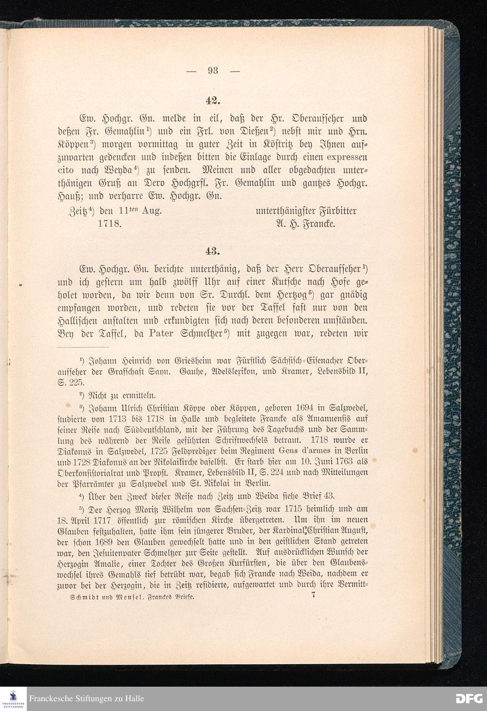 A.H.Franckes Briefe an den Grafen Heinrich XXIV. j.L. Reuß zu Köstritz und seine Gemahlin Eleonore aus den Jahren 1704 bis 1727 als Beitrag zur Geschichte des Pietismus herausgegeben von Dr.Berthold Schmidt Fürstl.Reuß j.L.Archivrat und Lic.theol. Otto Meusel Gymnasialoberlehrer in Schleiz. Leipzig, Verlag der Dürr'schen Buchhandlung 1905.