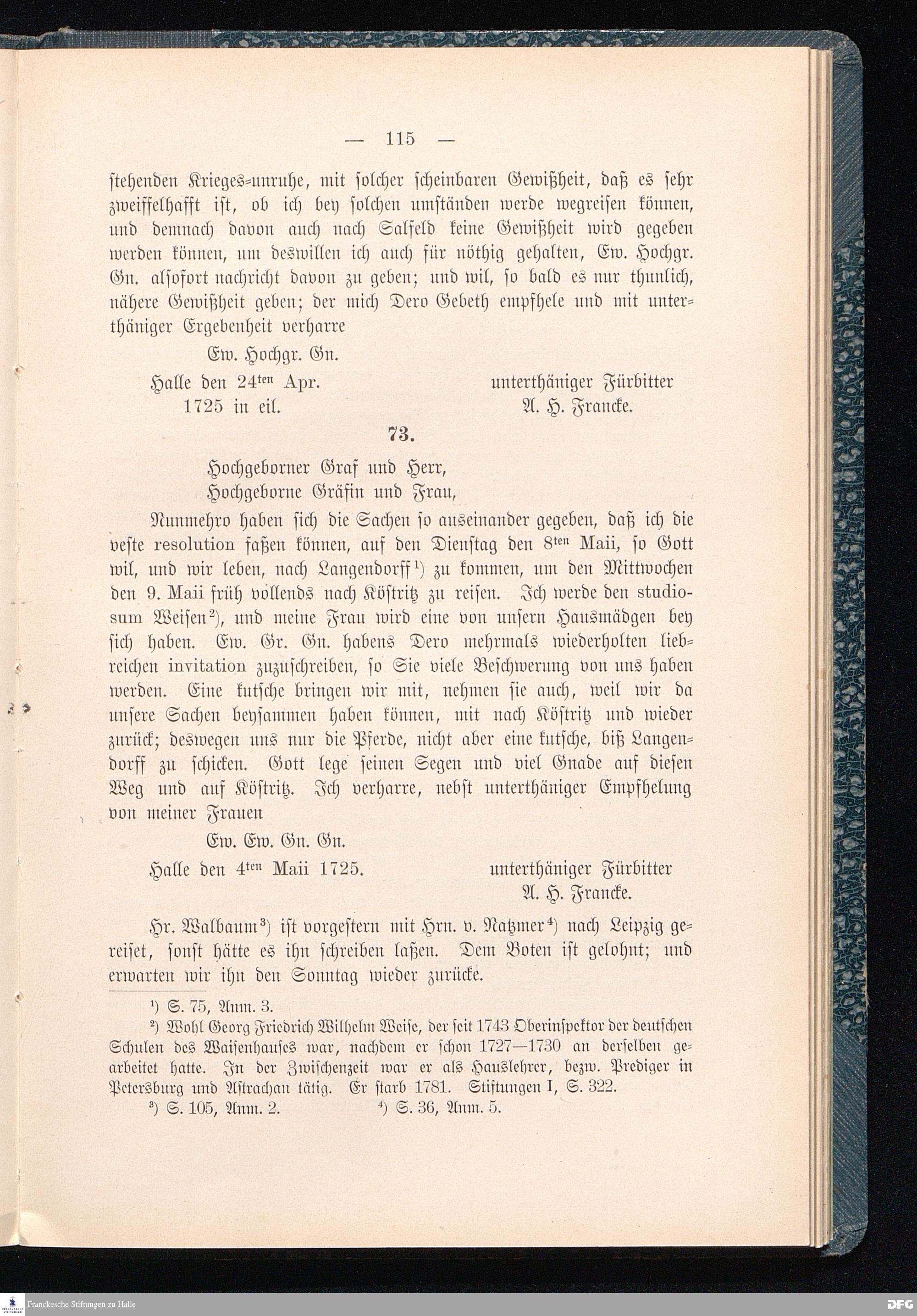 A.H.Franckes Briefe an den Grafen Heinrich XXIV. j.L. Reuß zu Köstritz und seine Gemahlin Eleonore aus den Jahren 1704 bis 1727 als Beitrag zur Geschichte des Pietismus herausgegeben von Dr.Berthold Schmidt Fürstl.Reuß j.L.Archivrat und Lic.theol. Otto Meusel Gymnasialoberlehrer in Schleiz. Leipzig, Verlag der Dürr'schen Buchhandlung 1905.