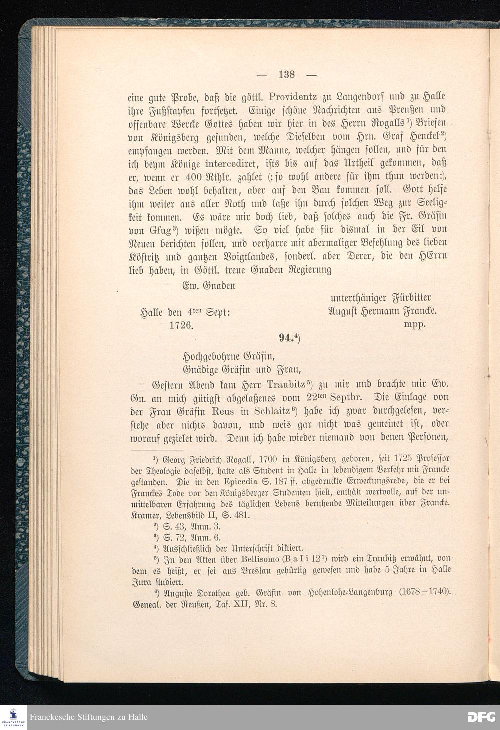 A.H.Franckes Briefe an den Grafen Heinrich XXIV. j.L. Reuß zu Köstritz und seine Gemahlin Eleonore aus den Jahren 1704 bis 1727 als Beitrag zur Geschichte des Pietismus herausgegeben von Dr.Berthold Schmidt Fürstl.Reuß j.L.Archivrat und Lic.theol. Otto Meusel Gymnasialoberlehrer in Schleiz. Leipzig, Verlag der Dürr'schen Buchhandlung 1905.