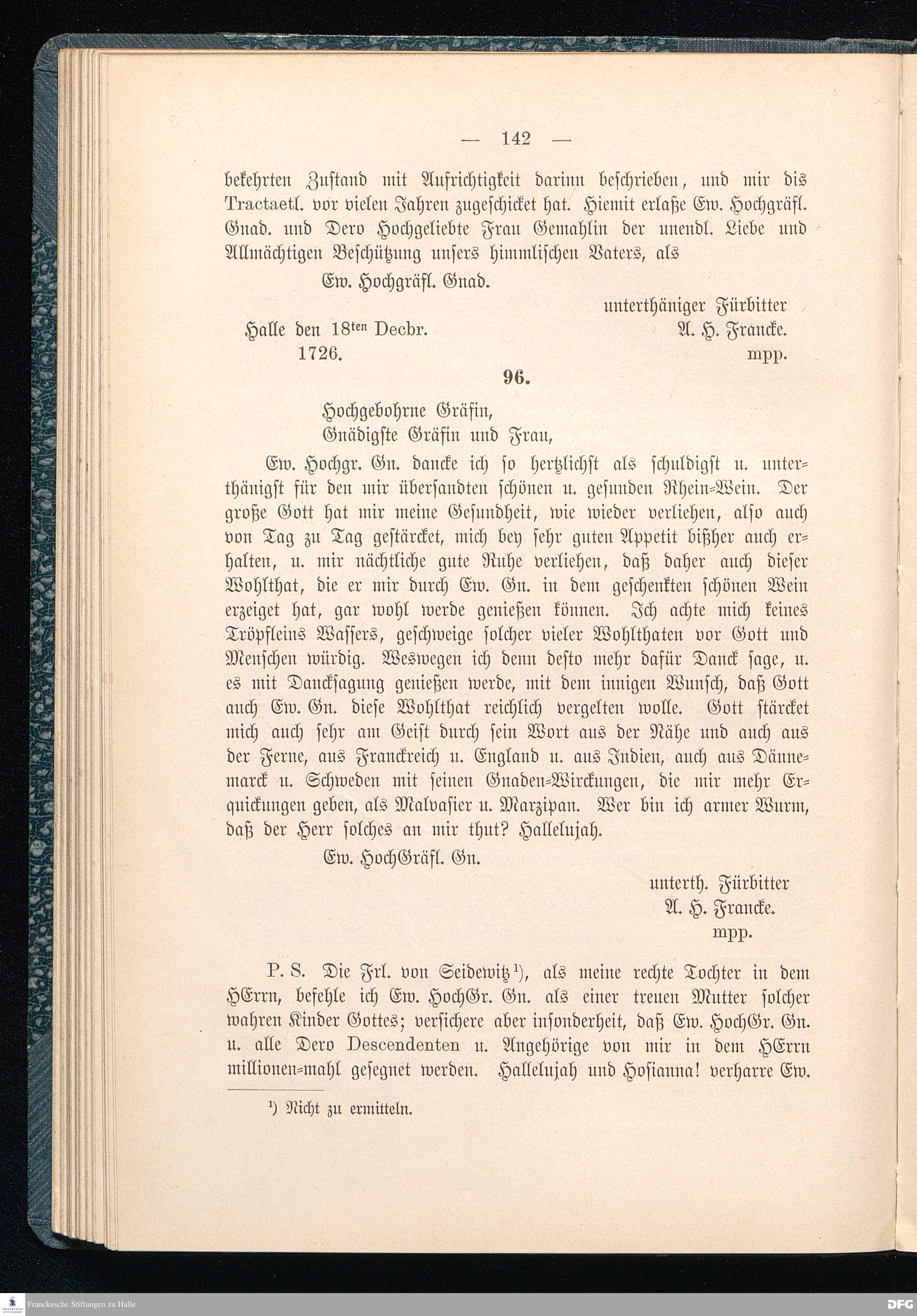 A.H.Franckes Briefe an den Grafen Heinrich XXIV. j.L. Reuß zu Köstritz und seine Gemahlin Eleonore aus den Jahren 1704 bis 1727 als Beitrag zur Geschichte des Pietismus herausgegeben von Dr.Berthold Schmidt Fürstl.Reuß j.L.Archivrat und Lic.theol. Otto Meusel Gymnasialoberlehrer in Schleiz. Leipzig, Verlag der Dürr'schen Buchhandlung 1905.