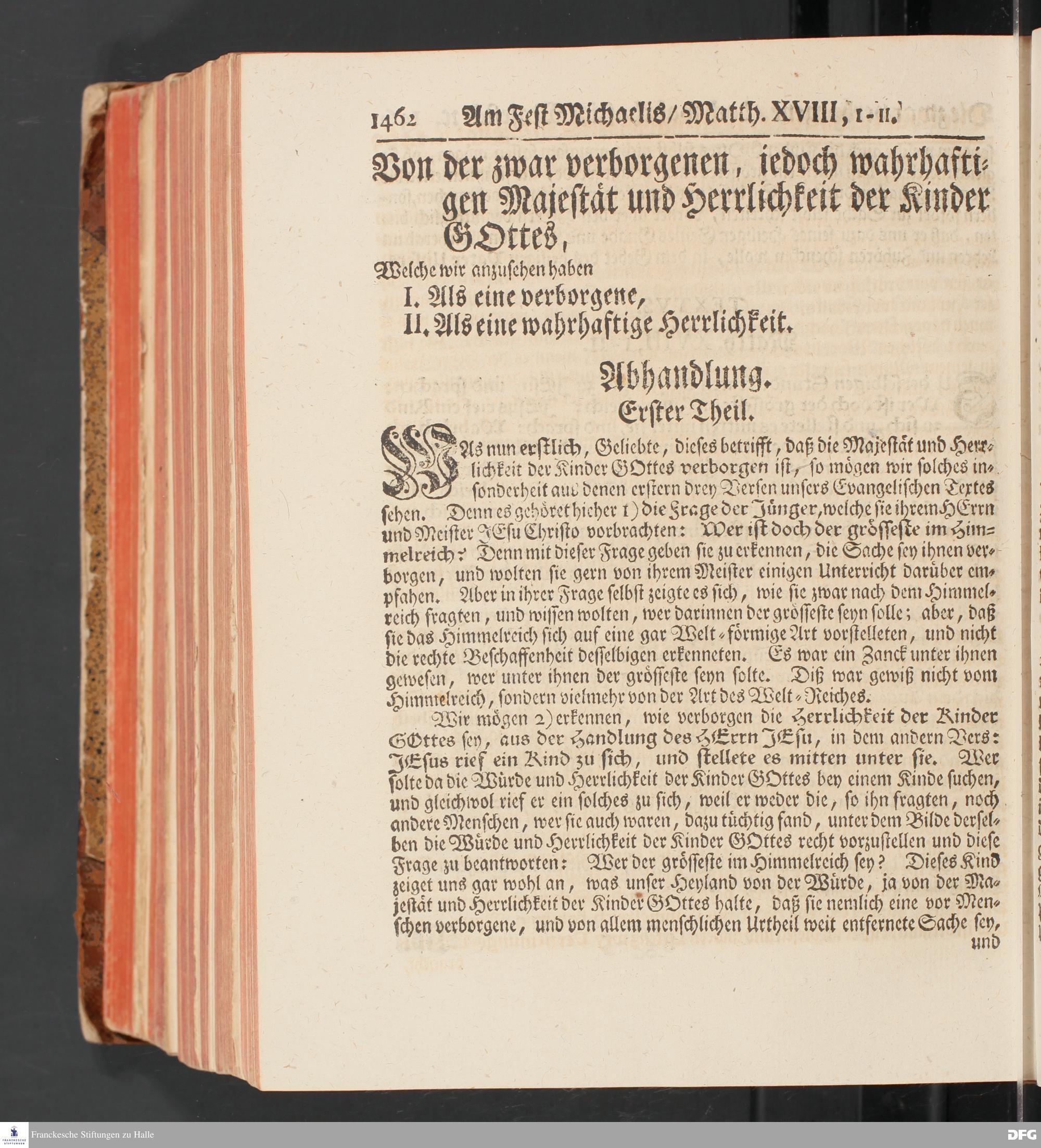 August Hermann Franckens, S.Theol.Prof.und Past. Sonn= und Fest=Tags=Predigten / Welche Theils in Halle, theils an verschiedenen auswärtigen Oertern, von wichtigen und auserlesenen Materien gehalten worden, Nebst Vorbereitung auf die hohen Feste und nützlichen Registern. Dritte Auflage. HALLE, gedruckt und verlegt im Wäysen=Hause MDCCXL. Mit Königl.Preuß.und Churfl.Brandenb.Privileg.