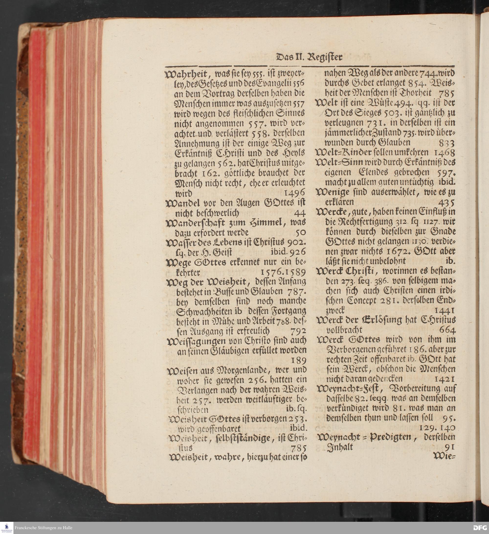 August Hermann Franckens, S.Theol.Prof.und Past. Sonn= und Fest=Tags=Predigten / Welche Theils in Halle, theils an verschiedenen auswärtigen Oertern, von wichtigen und auserlesenen Materien gehalten worden, Nebst Vorbereitung auf die hohen Feste und nützlichen Registern. Dritte Auflage. HALLE, gedruckt und verlegt im Wäysen=Hause MDCCXL. Mit Königl.Preuß.und Churfl.Brandenb.Privileg.