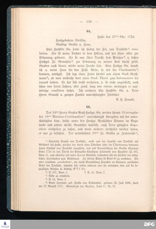A.H.Franckes Briefe an den Grafen Heinrich XXIV. j.L. Reuß zu Köstritz und seine Gemahlin Eleonore aus den Jahren 1704 bis 1727 als Beitrag zur Geschichte des Pietismus herausgegeben von Dr.Berthold Schmidt Fürstl.Reuß j.L.Archivrat und Lic.theol. Otto Meusel Gymnasialoberlehrer in Schleiz. Leipzig, Verlag der Dürr'schen Buchhandlung 1905.
