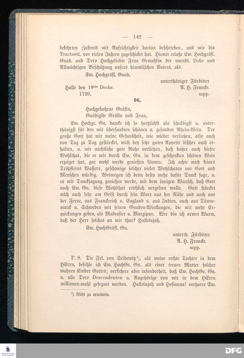 A.H.Franckes Briefe an den Grafen Heinrich XXIV. j.L. Reuß zu Köstritz und seine Gemahlin Eleonore aus den Jahren 1704 bis 1727 als Beitrag zur Geschichte des Pietismus herausgegeben von Dr.Berthold Schmidt Fürstl.Reuß j.L.Archivrat und Lic.theol. Otto Meusel Gymnasialoberlehrer in Schleiz. Leipzig, Verlag der Dürr'schen Buchhandlung 1905.
