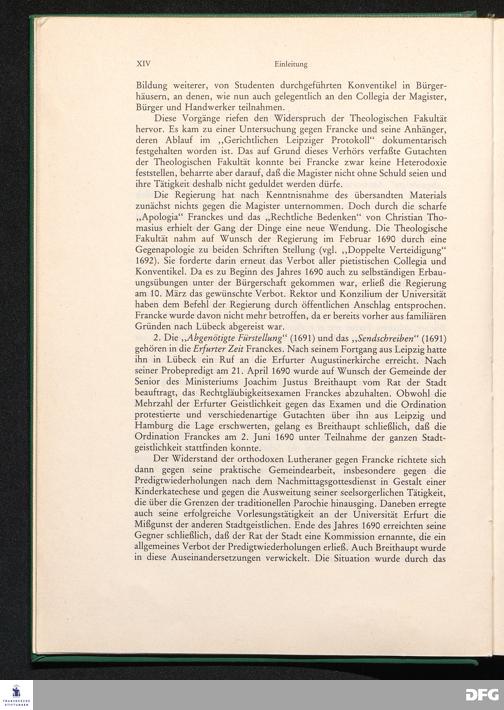 Gerichtliches Leipziger Protocoll In Sachen die so genannten Pietisten betreffend/ Samt Hn. Christian Thomasii. berümten JC. Rechtlichem Bedencken darüber; Und zu Ende beygefügter Apologia Oder Defensions-Schrifft Hn. M. Augusti Hermanni Franckens ...