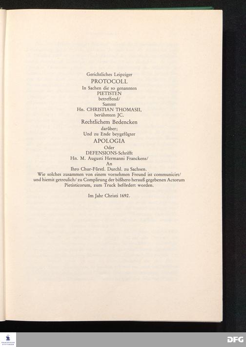 Gerichtliches Leipziger Protocoll In Sachen die so genannten Pietisten betreffend/ Samt Hn. Christian Thomasii. berümten JC. Rechtlichem Bedencken darüber; Und zu Ende beygefügter Apologia Oder Defensions-Schrifft Hn. M. Augusti Hermanni Franckens ...