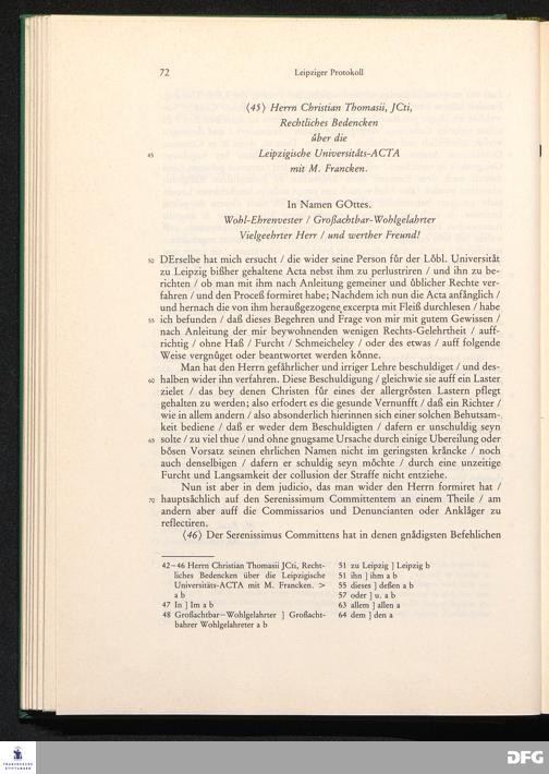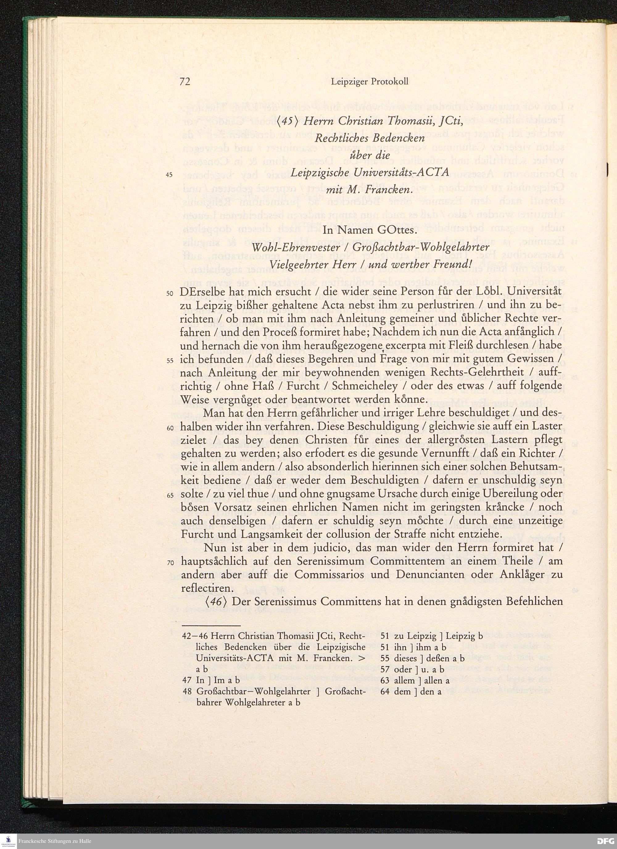 Gerichtliches Leipziger Protocoll In Sachen die so genannten Pietisten betreffend/ Samt Hn. Christian Thomasii. berümten JC. Rechtlichem Bedencken darüber; Und zu Ende beygefügter Apologia Oder Defensions-Schrifft Hn. M. Augusti Hermanni Franckens ...