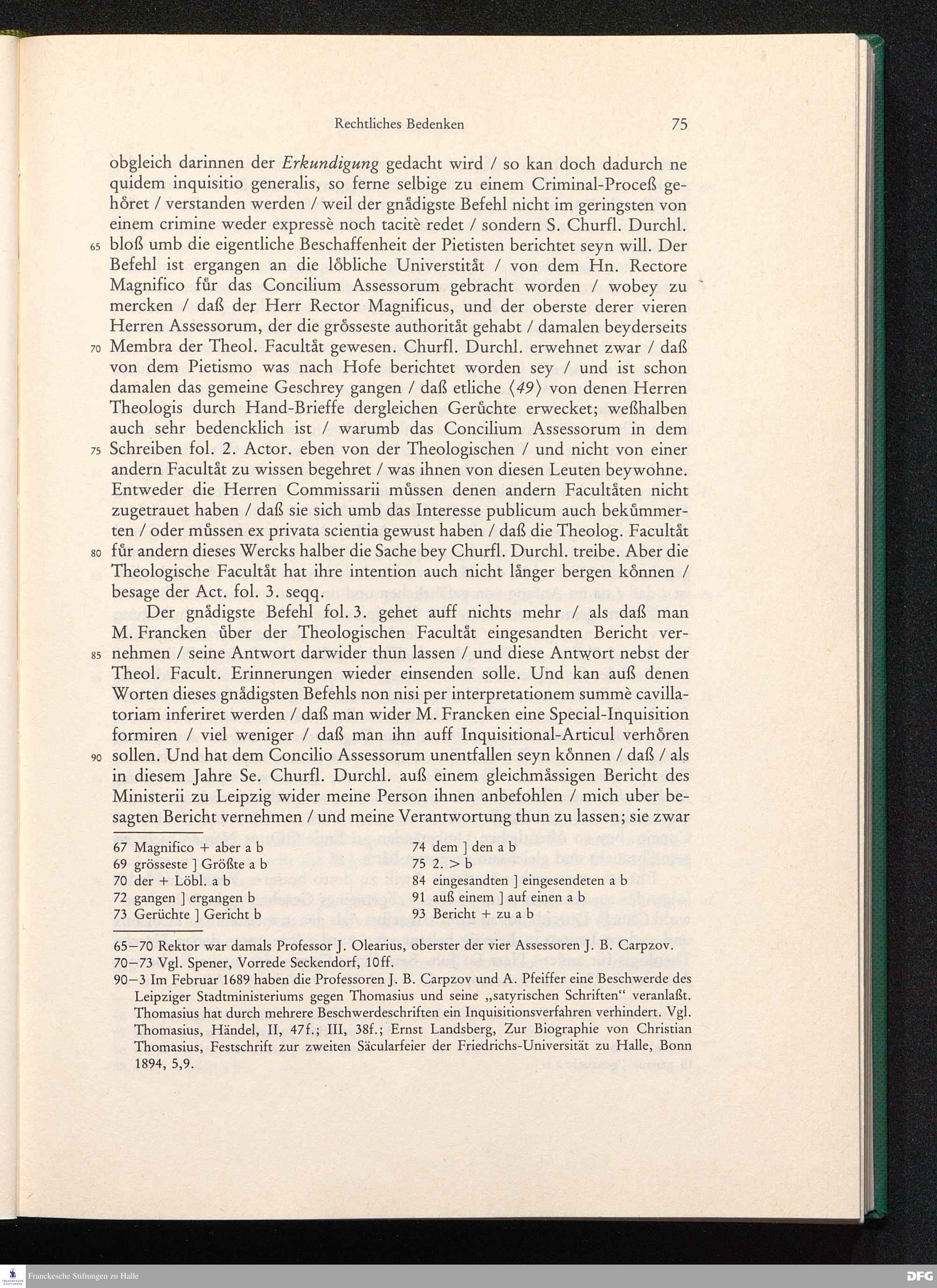 Gerichtliches Leipziger Protocoll In Sachen die so genannten Pietisten betreffend/ Samt Hn. Christian Thomasii. berümten JC. Rechtlichem Bedencken darüber; Und zu Ende beygefügter Apologia Oder Defensions-Schrifft Hn. M. Augusti Hermanni Franckens ...