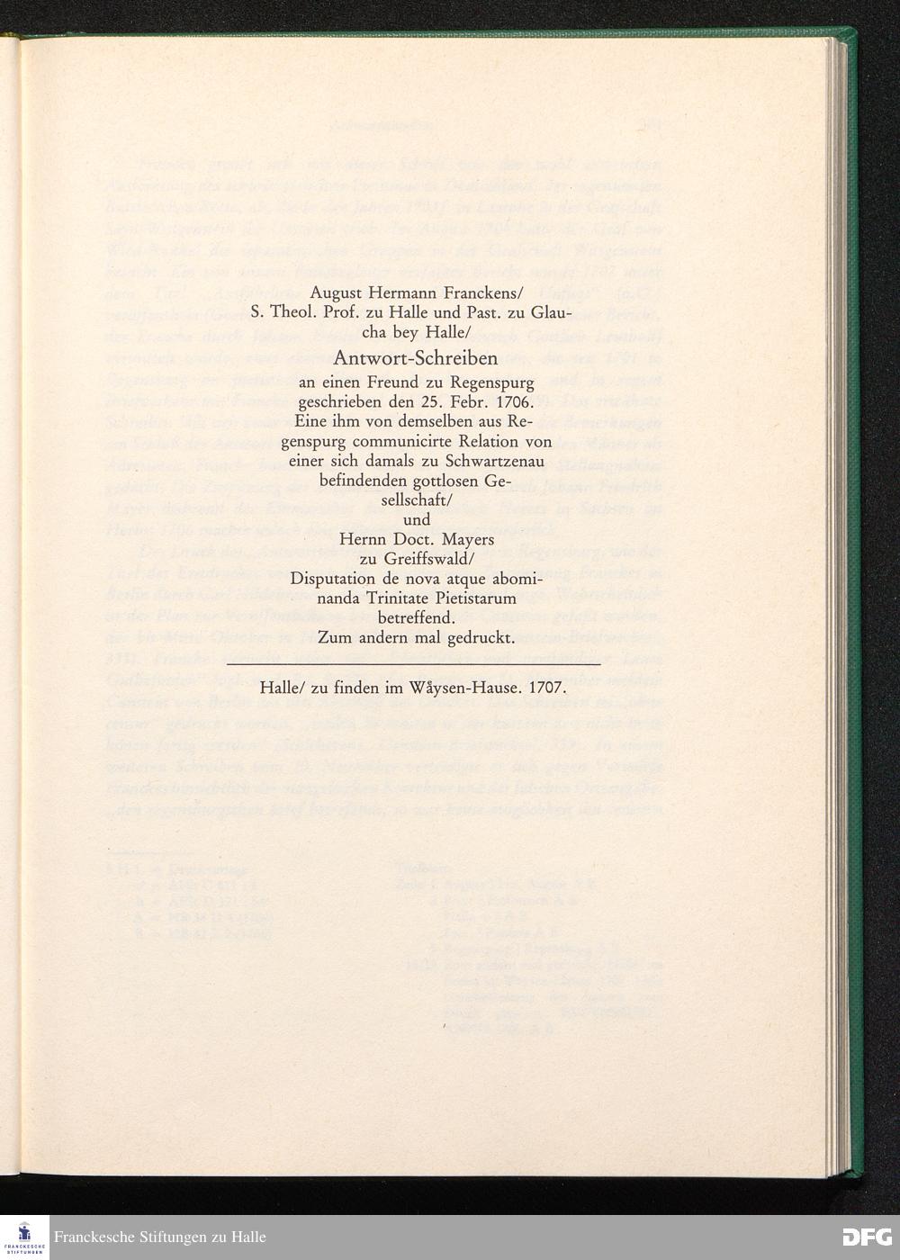 August Hermann Franckens, S. Theol. Prof. zu Halle und Past. zu Glaucha bey Halle, Antwort-Schreiben an einen Freund zu Regenspurg geschrieben den 25. Febr. 1706.