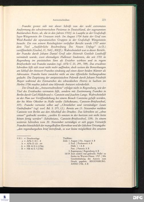 August Hermann Franckens, S. Th. Prof. zu Halle und Past. zu Glaucha vor Halle, Aufrichtige und gründliche Beantwortung Eines an ihn abgelassenen und hiebey abgedruckten Send-Schreibens Eines Christl. Theologi, Der Professorum Theologiae zu Halle ...