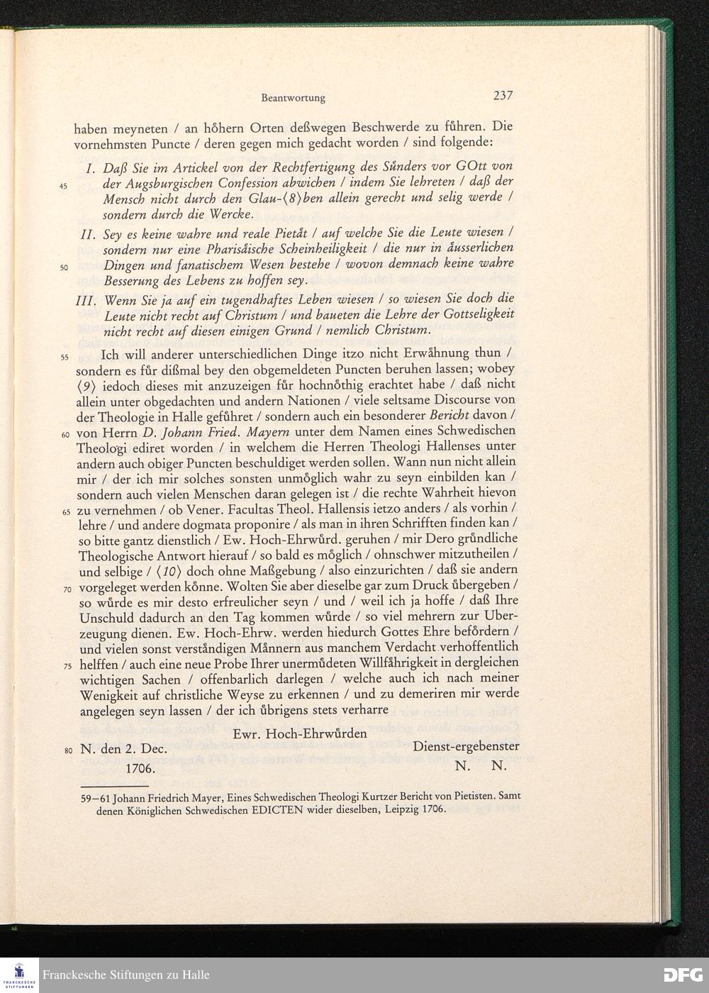 August Hermann Franckens, S. Theol. Prof. zu Halle und Past. zu Glaucha vor Halle, Gründliche und Gewissenhafte Verantwortung gegen Hn. D. Johann Friedrich Mayers, Professoris Theologi auff der Universität zu Greiffswald, harte und unwahrhaffte Beschuldigungen ...