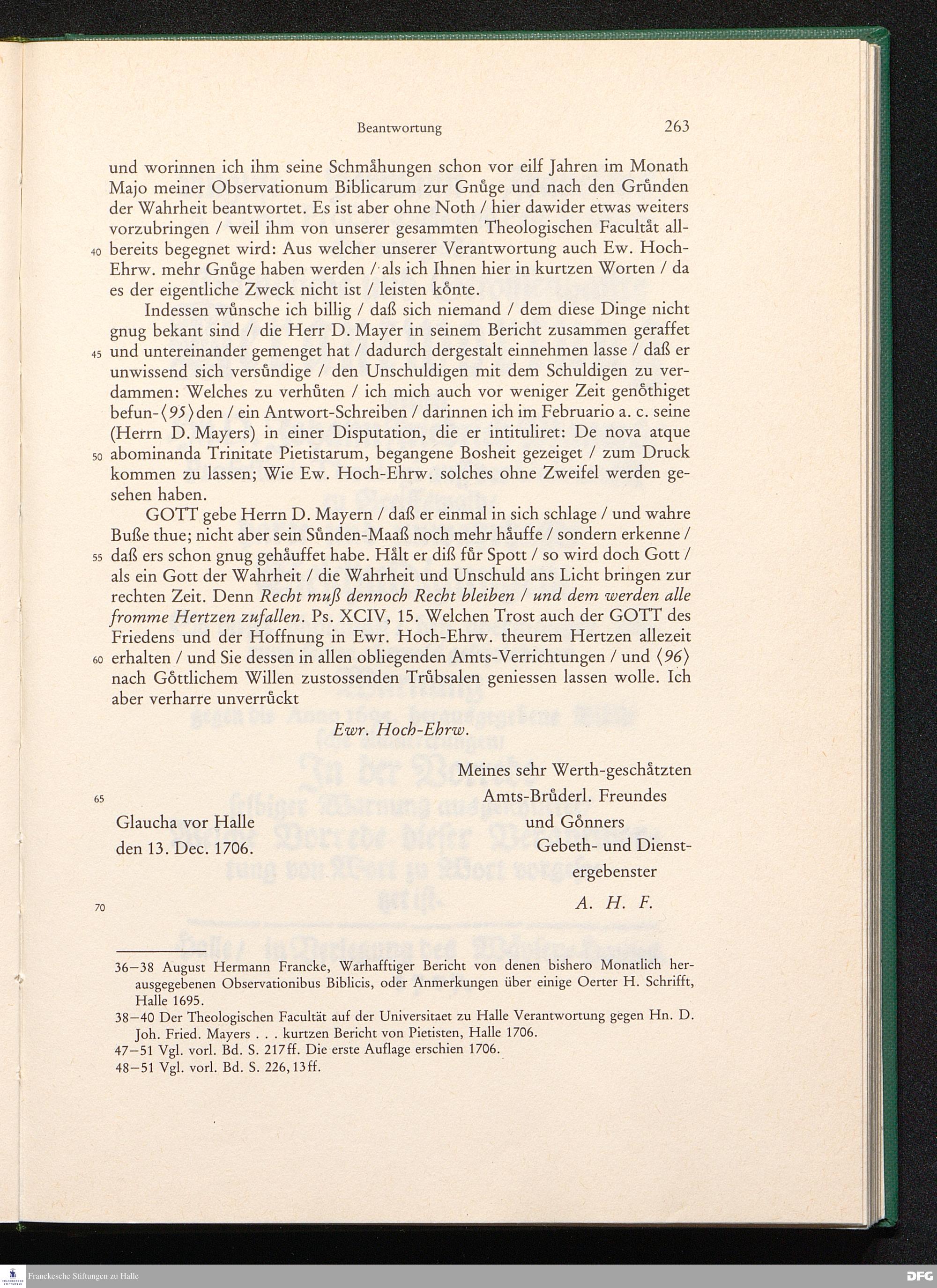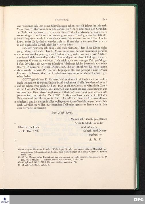 August Hermann Franckens, S. Theol. Prof. zu Halle und Past. zu Glaucha vor Halle, Gründliche und Gewissenhafte Verantwortung gegen Hn. D. Johann Friedrich Mayers, Professoris Theologi auff der Universität zu Greiffswald, harte und unwahrhaffte Beschuldigungen ...