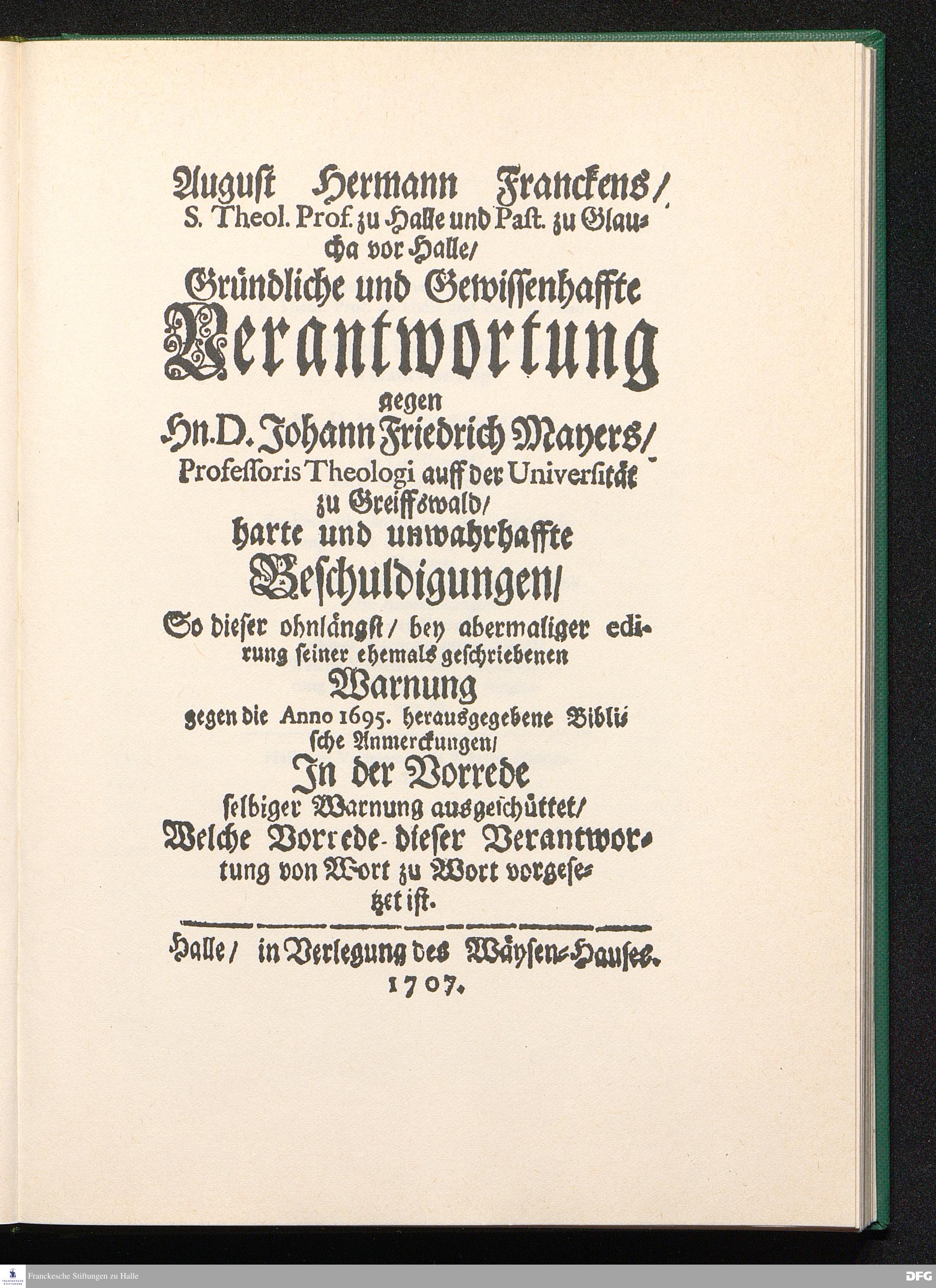 August Hermann Franckens, S. Theol. Prof. zu Halle und Past. zu Glaucha vor Halle, Gründliche und Gewissenhafte Verantwortung gegen Hn. D. Johann Friedrich Mayers, Professoris Theologi auff der Universität zu Greiffswald, harte und unwahrhaffte Beschuldigungen ...