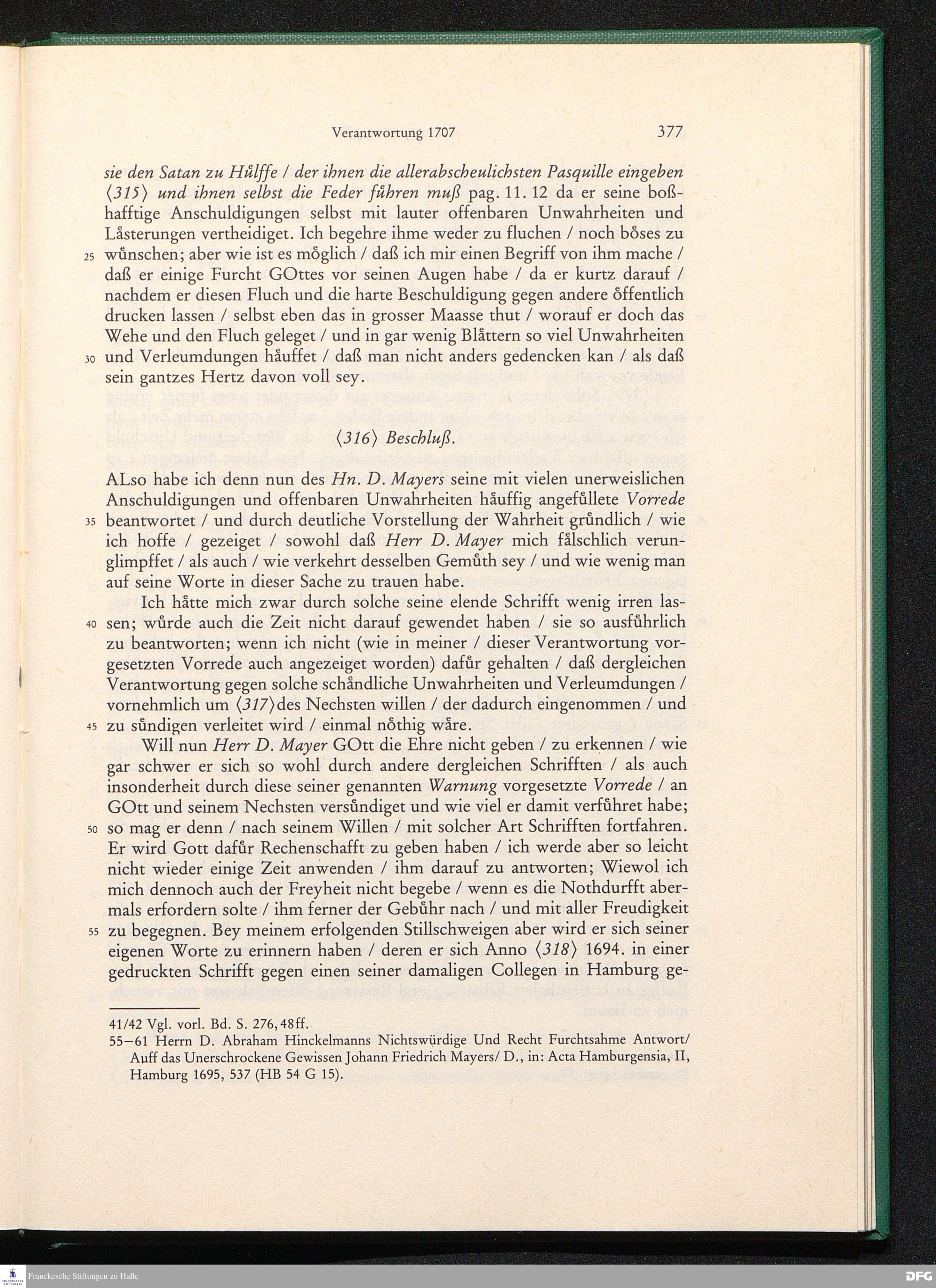 August Hermann Franckens, S. Theol. Prof. zu Halle und Past. zu Glaucha vor Halle, Gründliche und Gewissenhafte Verantwortung gegen Hn. D. Johann Friedrich Mayers, Professoris Theologi auff der Universität zu Greiffswald, harte und unwahrhaffte Beschuldigungen ...