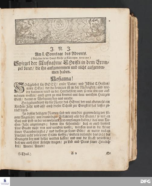 Spiegel der Aufnahme CHristi in dem Exempel derer / die ihn aufgenommen und nicht aufgenommen haben. [Predigt] Am I. Sonntage des Advents.