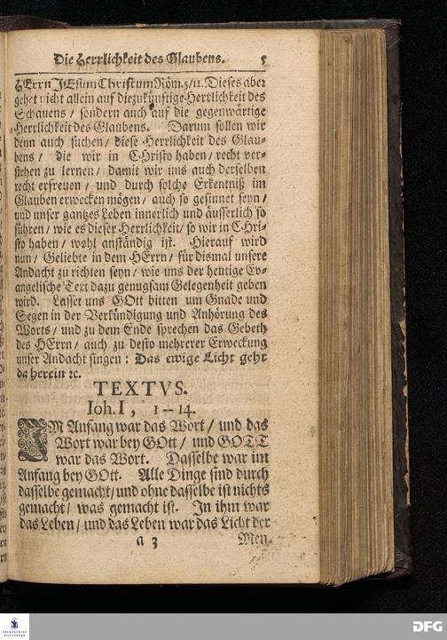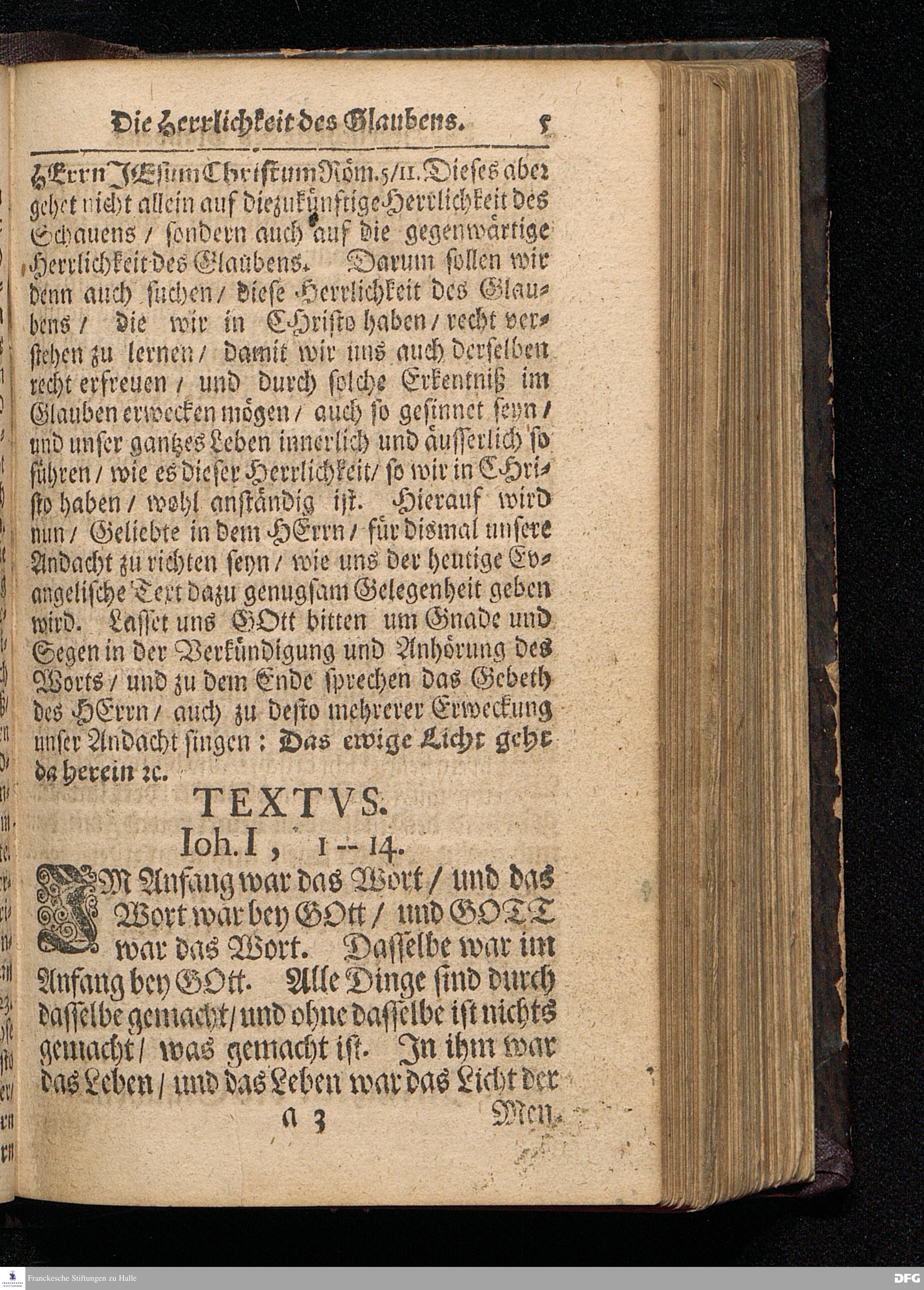 Die Herrlichkeit des Glaubens / Am 3ten Weyhnacht=Feyertage MDCCXV. In der Predigt aus dem Evangelio Ioh. I,1--14. In der Schul=Kirche zu Halle vorgestellet von August Hermann Francken / S.Theolog.Prof.& Past.zu S.Ulrich / und des Gymnasii Scholarcha. HALLE / Gedruckt und zu finden im Wäysen=Hause. Anno 1716.