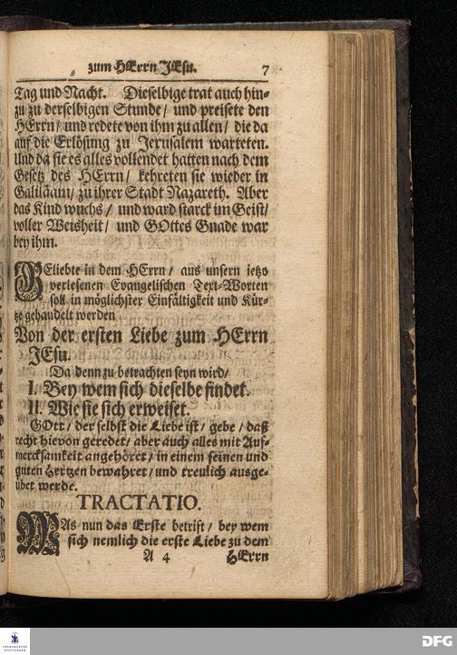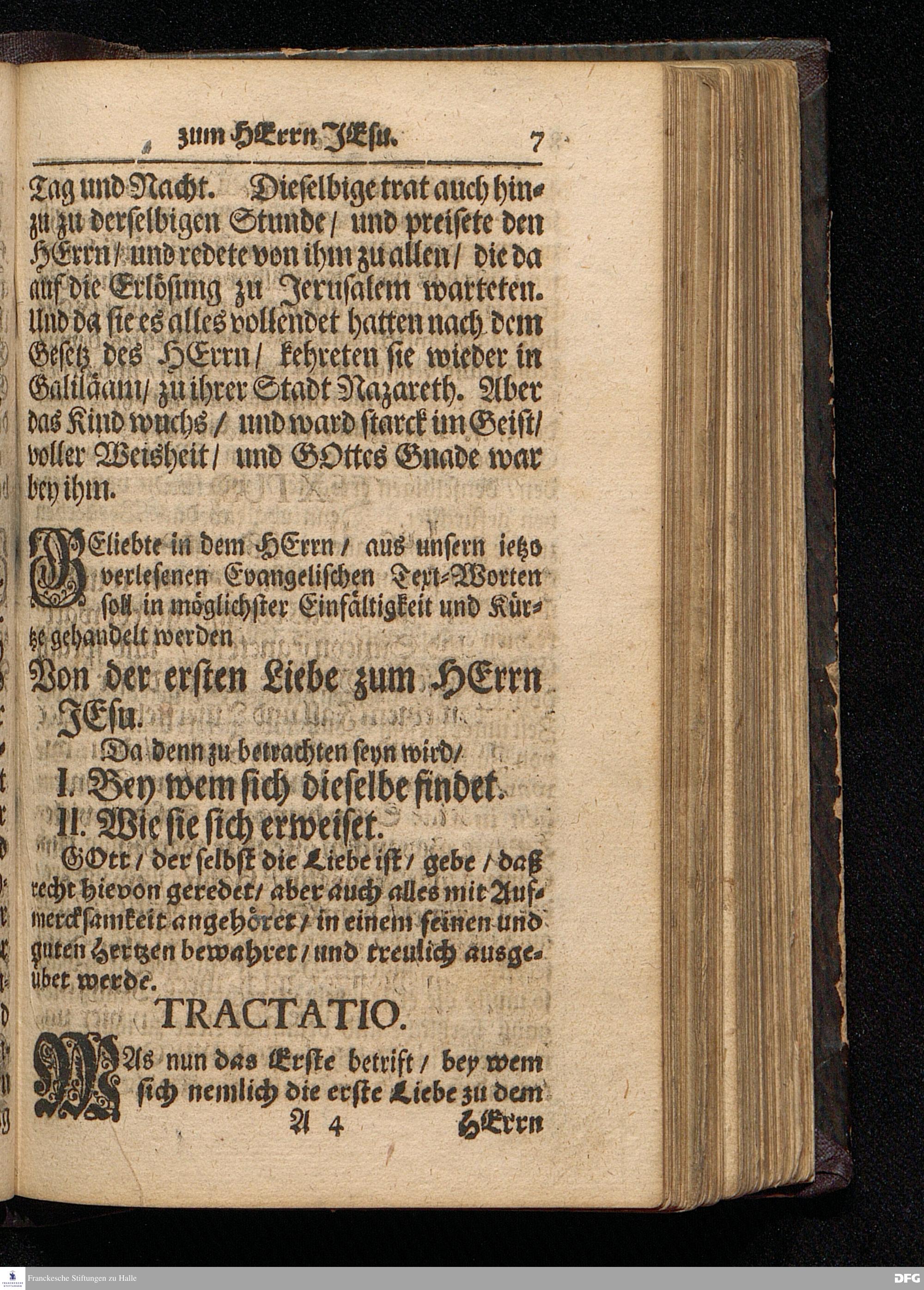 Die Erste Liebe Zum HErrn JEsu / Aus dem Evangelischen Text Luc.II, 33--40. Am Sonntag nach dem Christ=Tage In der S.Ulrichs=Kirche in Halle / vorgestellet von August Hermann Francken / S.Theolog.Prof.& Past. zu S.Ulrich / und des Gymnasii Scholarcha. HALLE / Gedruckt und zu finden im Wäysen=Hause. MDCCXVI.