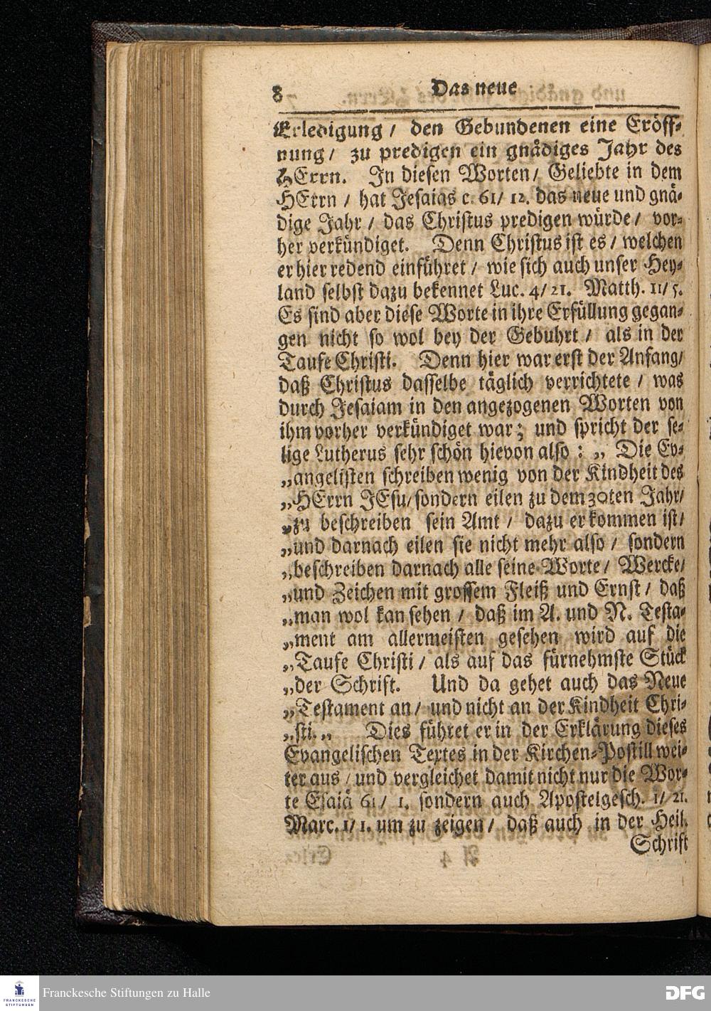 Das Neue und Gnädige Jahr des HErrn / Am Sonntag nach dem Neuen Jahr MDCCXVI. Aus dem Evangelio Matth.III, 13--17. In der St.Georgen=Kirche zu Glaucha an Halle vorgestellet von August Herman[n] Francken / S.Theolog.Prof.& Past.zu S.Ulrich / und des Gymansii Scholarcha. HALLE / Gedruckt und zu finden im Wäysen=Hause.
