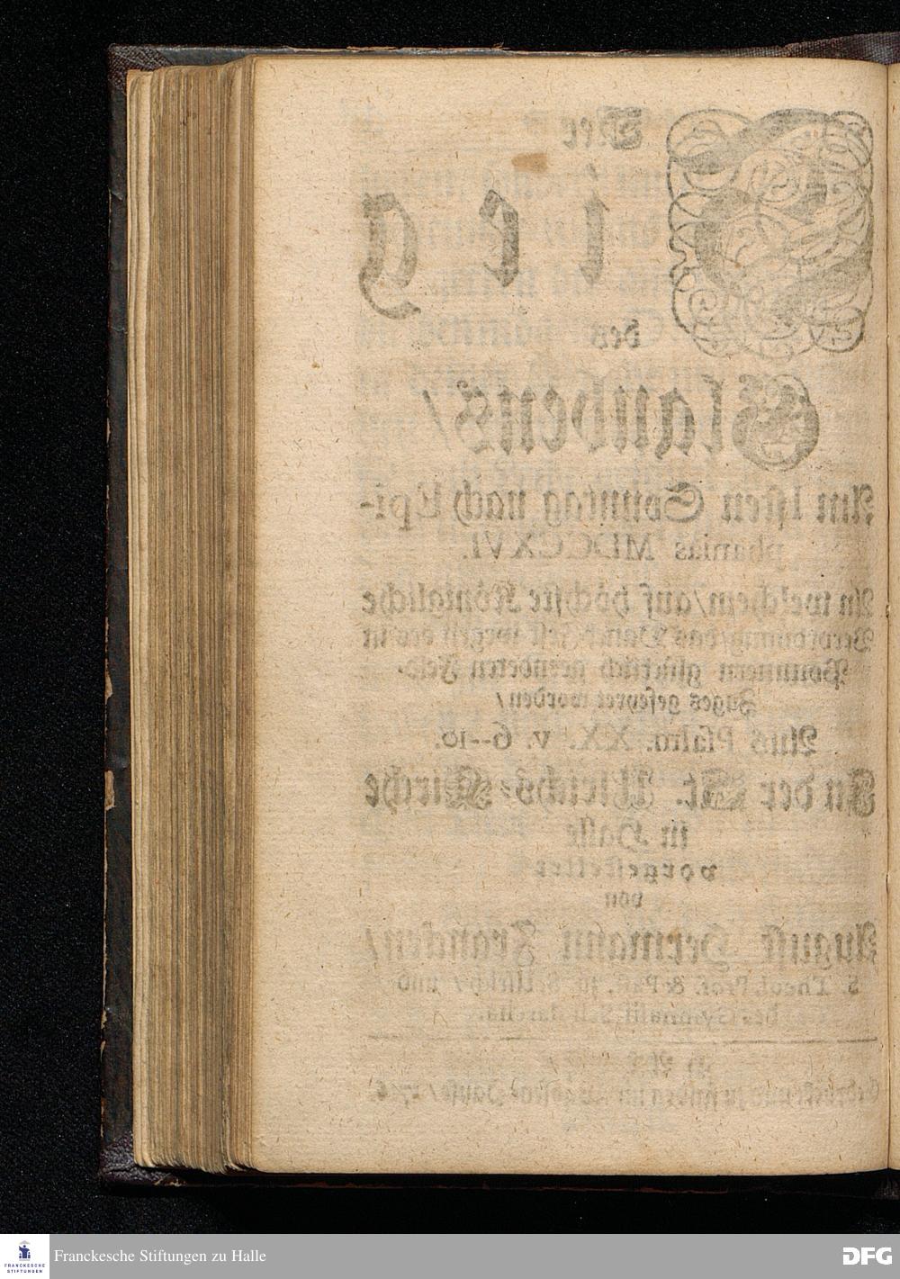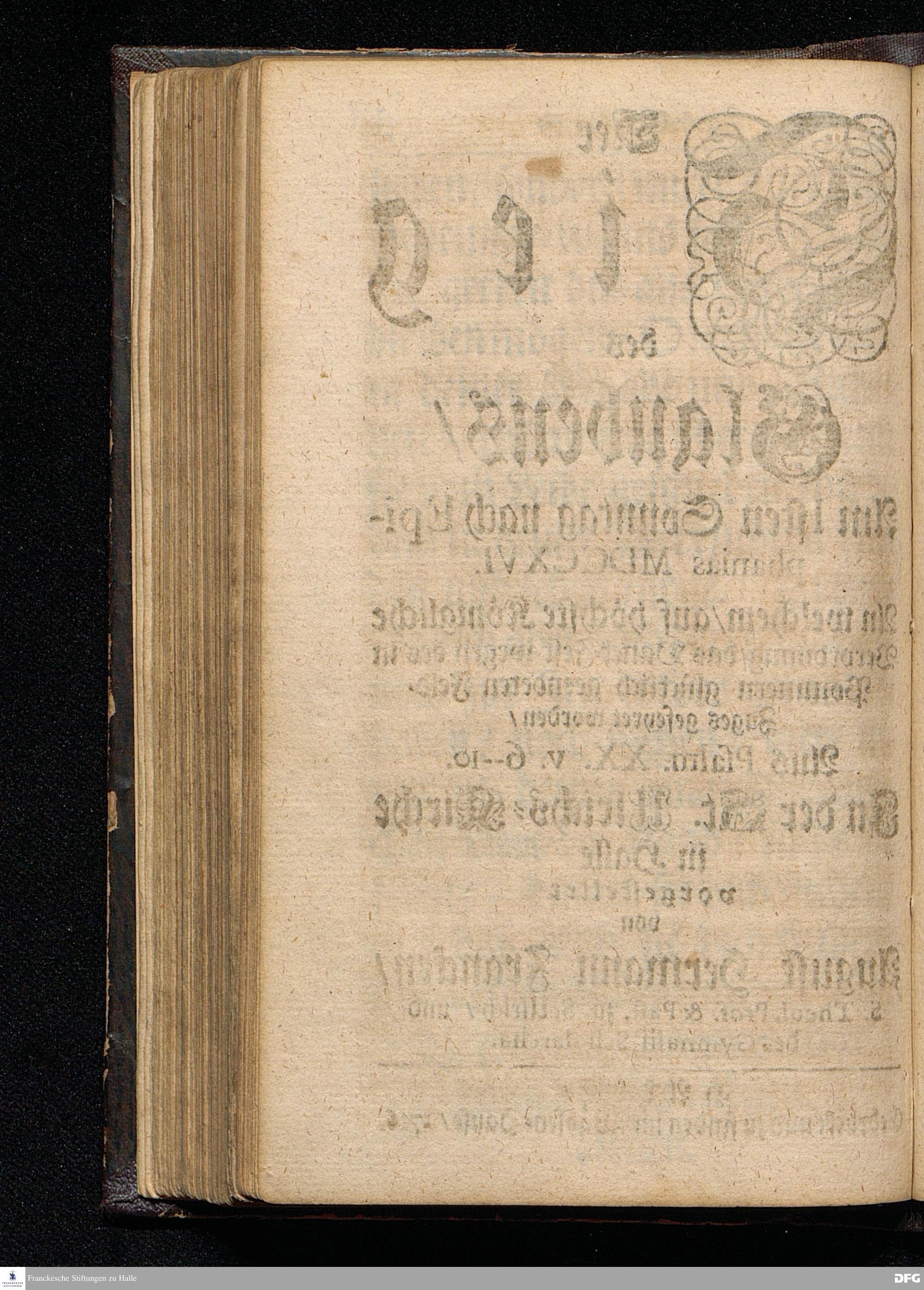 Der Sieg des Glaubens / Am Isten Sonntag nach Epiphanias MDCCXVI. An welchem / auf höchste Königliche Verordnung / das Danck=Fest wegen des in Pommern glücklich geendeten Feld=Zuges gefeyret worden / Aus Psalm.XX. v.6--10. In der St.Ulrichs=Kirche in Halle vorgestellet von August Hermann Francken / S.Theol.Prof.& Past.zu S.Ulrich / und des Gymnasii Scholarcha. HALLE / Gedruckt und zu finden im Wäysen=Hause / 1716.