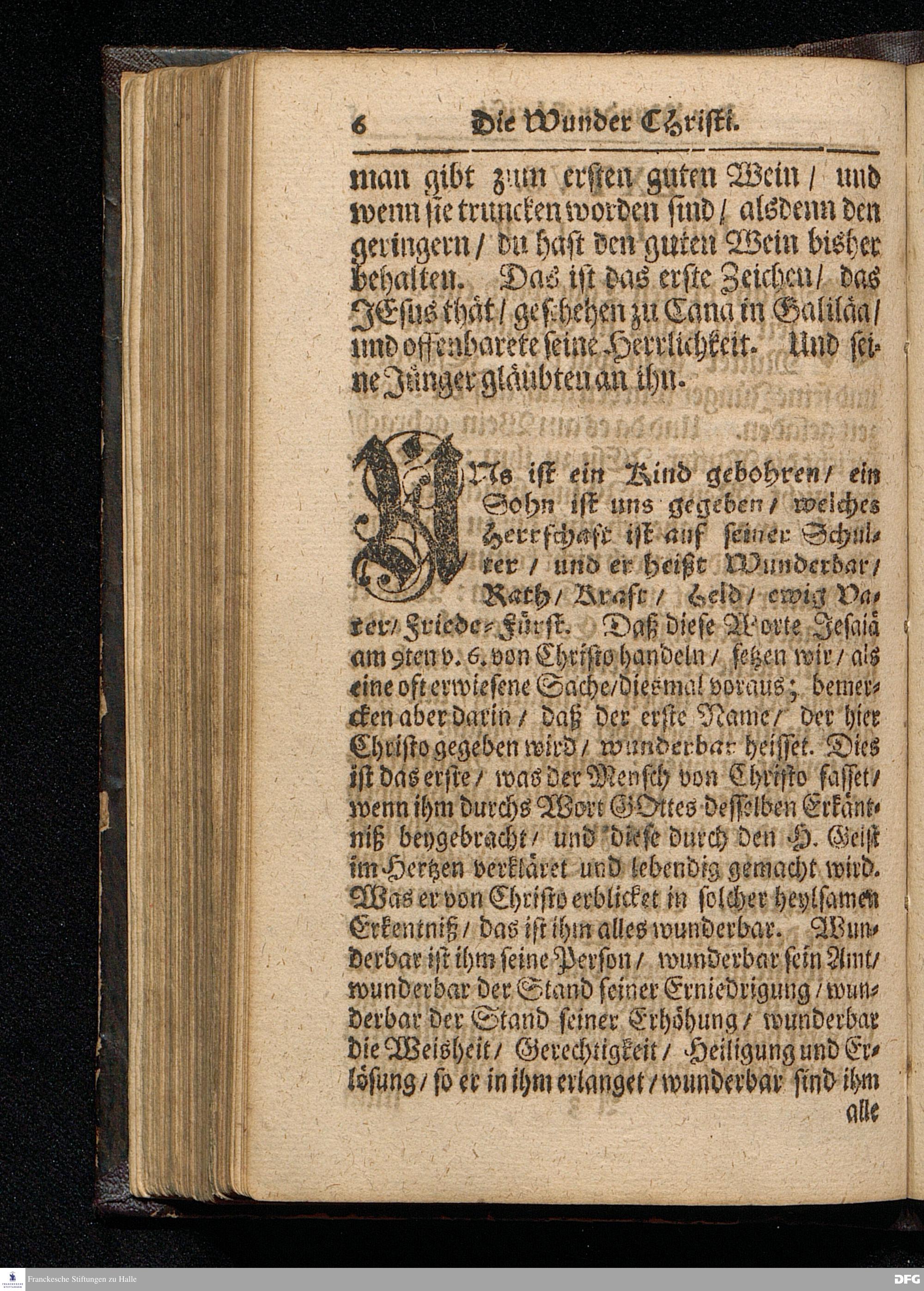 Die Wunder Christi / So wol Nach ihrer eigentlichen Beschaffenheit / als auch nach ihrem rechten Gebrauch / Aus dem Evangelischen Text Joh.II, 1--11. Am IIdern Sonntag nach Epiphanias MDCCXVI. Und dem darauf diesmal verlegten Crönungs=Fest / In der St.Ulrichs=Kirche in Halle vorgestellet von August Herman[n] Francken / S.Theolog.Prof.& Past.zu S.Ulrich / und des Gymnasii Scholarcha. HALLE / Gedruckt und zu finden im Wäysen=Hause. Anno 1716.