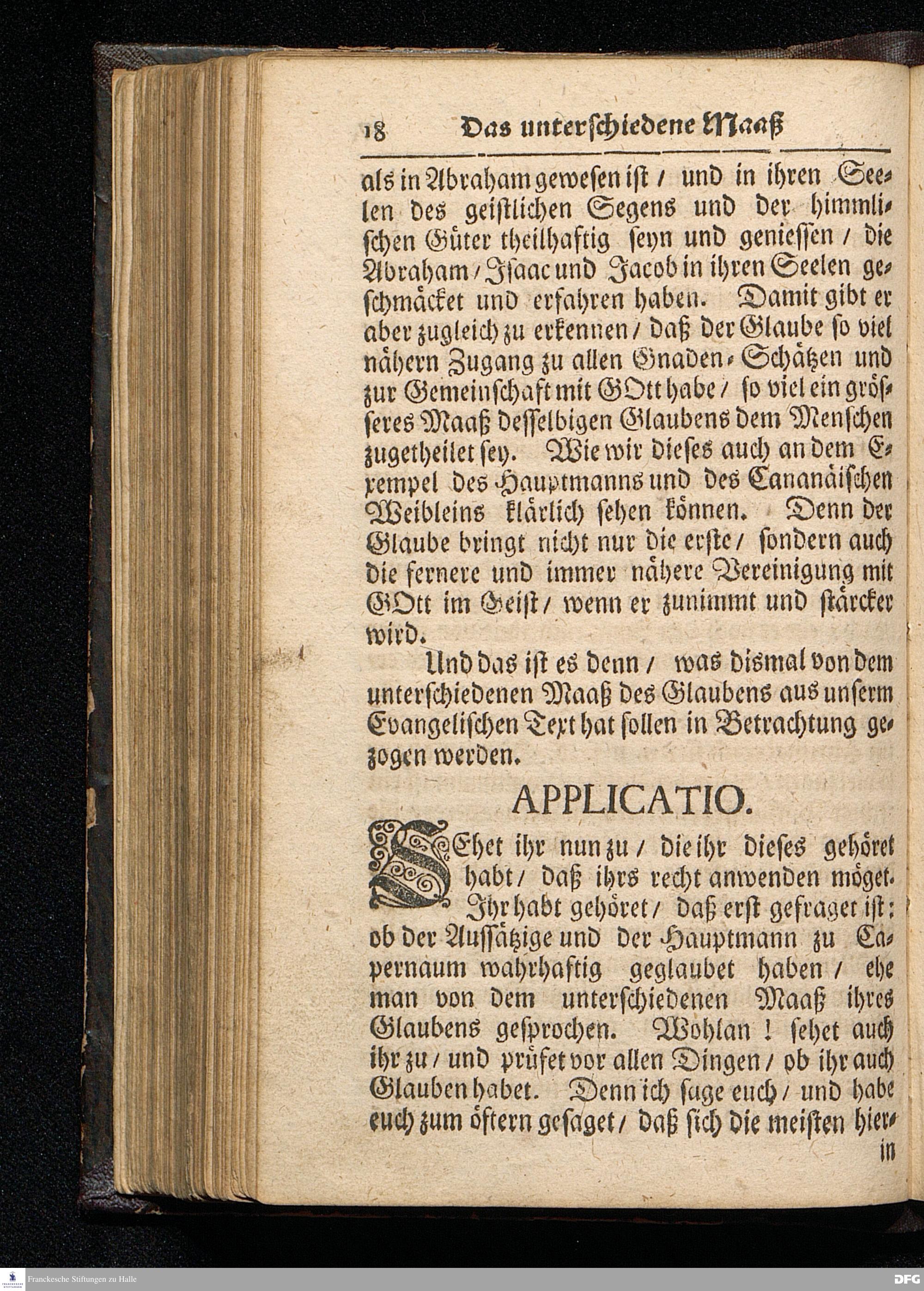Das Unterschiedene Maaß des Glaubens / Aus dem Evangelischen Text Matth.VIII, 1--13. Am IIIten Sonntage nach Epiphanias MDCCXVI. In der St.Ulrichs=Kirchen in Halle vorgestellet von August Hermann Francken / S.Theol.Prof.& Past.zu S.Ulrich / und des Gymnasii Scholarcha. HALLE / Gedruckt und zu finden im Wäysen=Hause / 1716.
