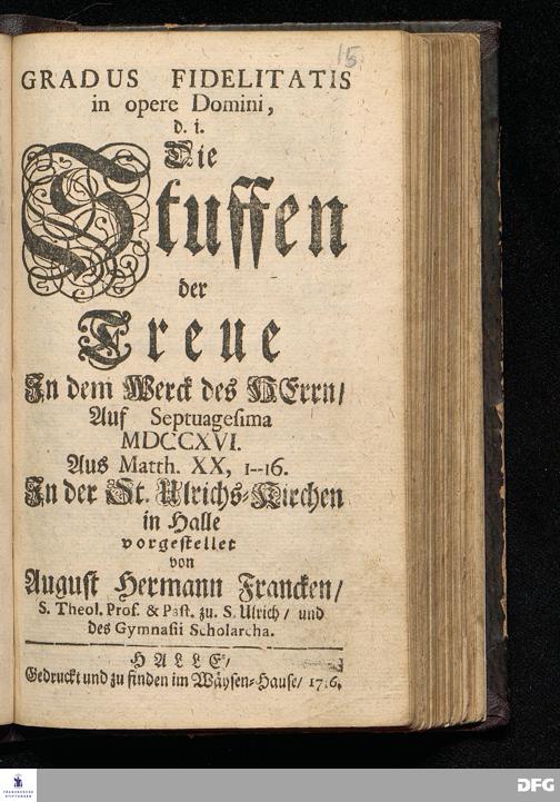 GRADUS FIDELITATIS in opere Domini, d.i. Die Stuffen der Treue In dem Werck des HErrn / Auf Septuagesima MDCCXVI. Aus Matth.XX, 1--16. In der St.Ulrichs=Kirchen in Halle vorgestellet von August Hermann Francken / S.Theol.Prof.& Past.zu S.Ulrich / und des Gymnasii Scholarcha. HALLE / Gedruckt und zu finden im Wäysen=Hause. 1716.