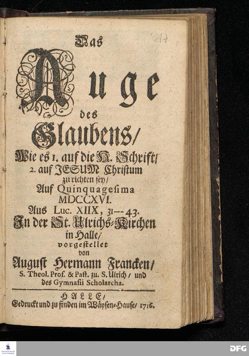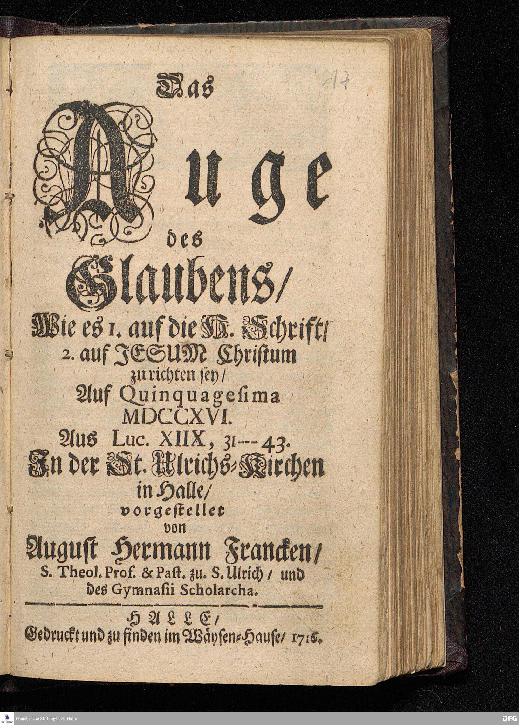 Das Auge des Glaubens / Wie es 1. auf die H.Schrift / 2.auf JESUM Christum zu richten sey / Auf Quinquagesima MDCCXVI. Aus Luc. XIIX, 31--43. In der St.Ulrichs=Kirchen in Halle / vorgestellet von August Hermann Francken / S.Theol.Prof.& Past. zu S.Ulrich und des Gymnasii Scholarcha. HALLE / Gedruckt und zu finden im Wäysen=Hause 1716.