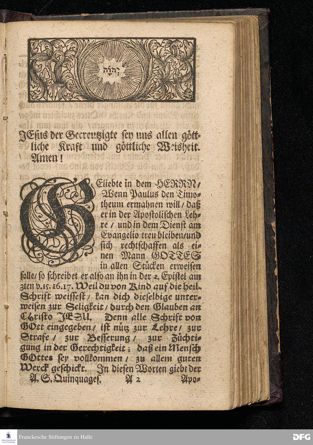 Das Auge des Glaubens / Wie es 1. auf die H.Schrift / 2.auf JESUM Christum zu richten sey / Auf Quinquagesima MDCCXVI. Aus Luc. XIIX, 31--43. In der St.Ulrichs=Kirchen in Halle / vorgestellet von August Hermann Francken / S.Theol.Prof.& Past. zu S.Ulrich und des Gymnasii Scholarcha. HALLE / Gedruckt und zu finden im Wäysen=Hause 1716.