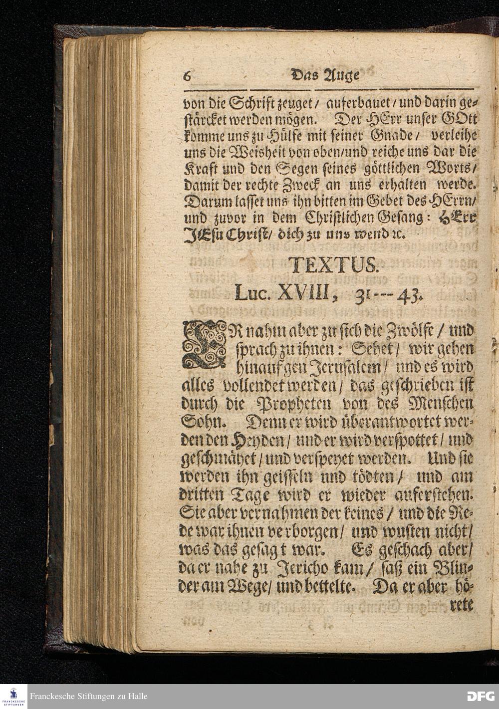 Das Auge des Glaubens / Wie es 1. auf die H.Schrift / 2.auf JESUM Christum zu richten sey / Auf Quinquagesima MDCCXVI. Aus Luc. XIIX, 31--43. In der St.Ulrichs=Kirchen in Halle / vorgestellet von August Hermann Francken / S.Theol.Prof.& Past. zu S.Ulrich und des Gymnasii Scholarcha. HALLE / Gedruckt und zu finden im Wäysen=Hause 1716.