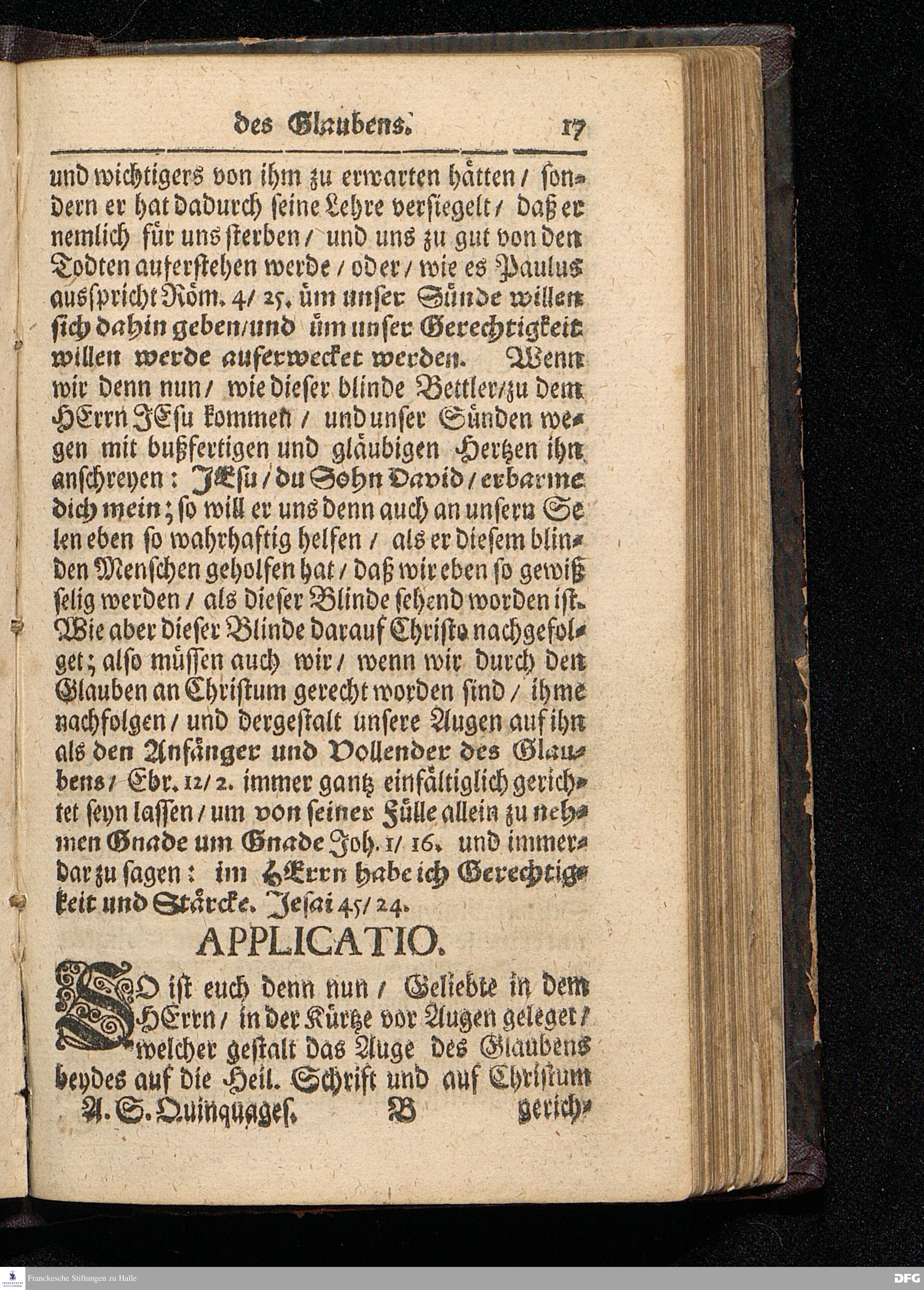 Das Auge des Glaubens / Wie es 1. auf die H.Schrift / 2.auf JESUM Christum zu richten sey / Auf Quinquagesima MDCCXVI. Aus Luc. XIIX, 31--43. In der St.Ulrichs=Kirchen in Halle / vorgestellet von August Hermann Francken / S.Theol.Prof.& Past. zu S.Ulrich und des Gymnasii Scholarcha. HALLE / Gedruckt und zu finden im Wäysen=Hause 1716.