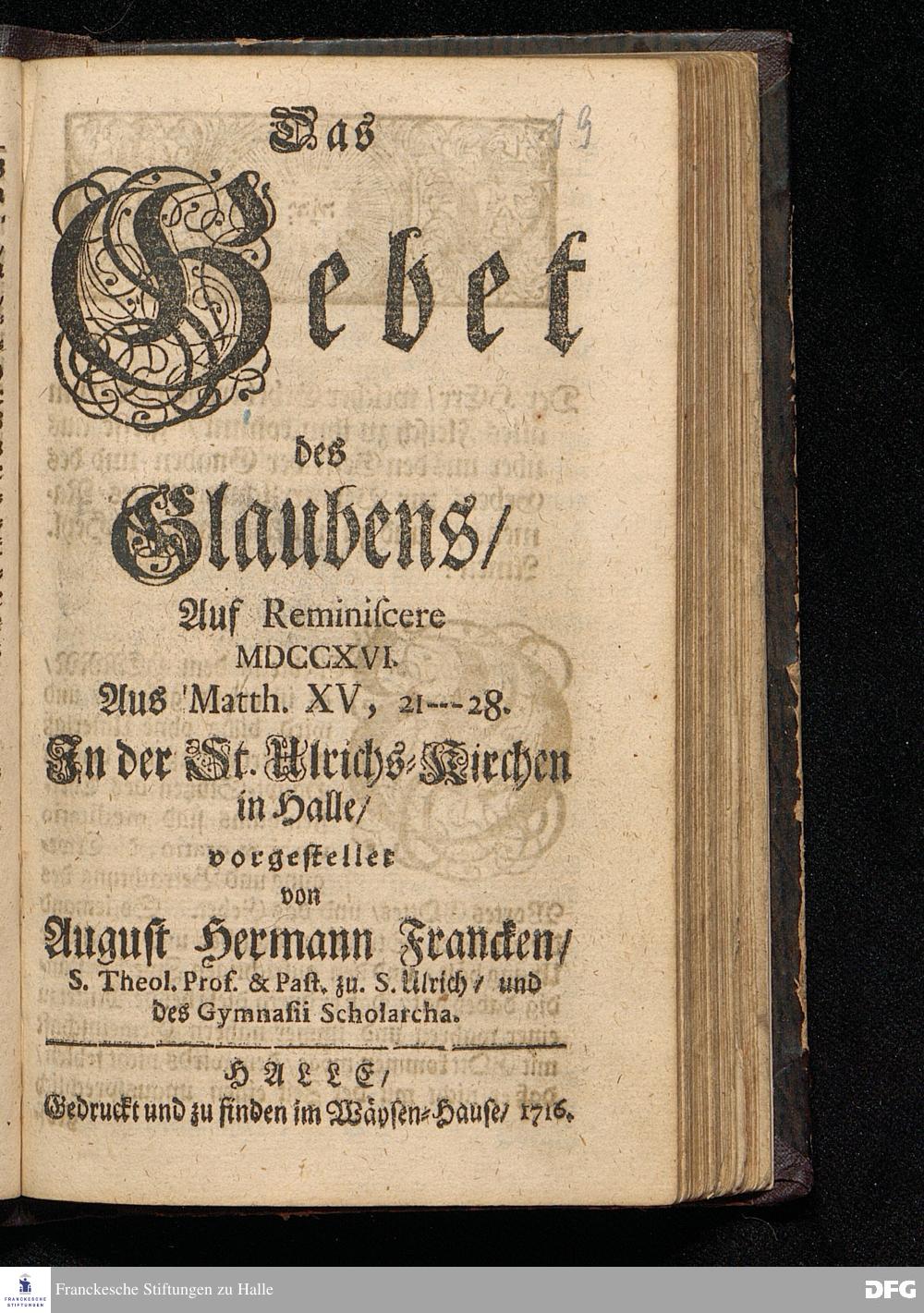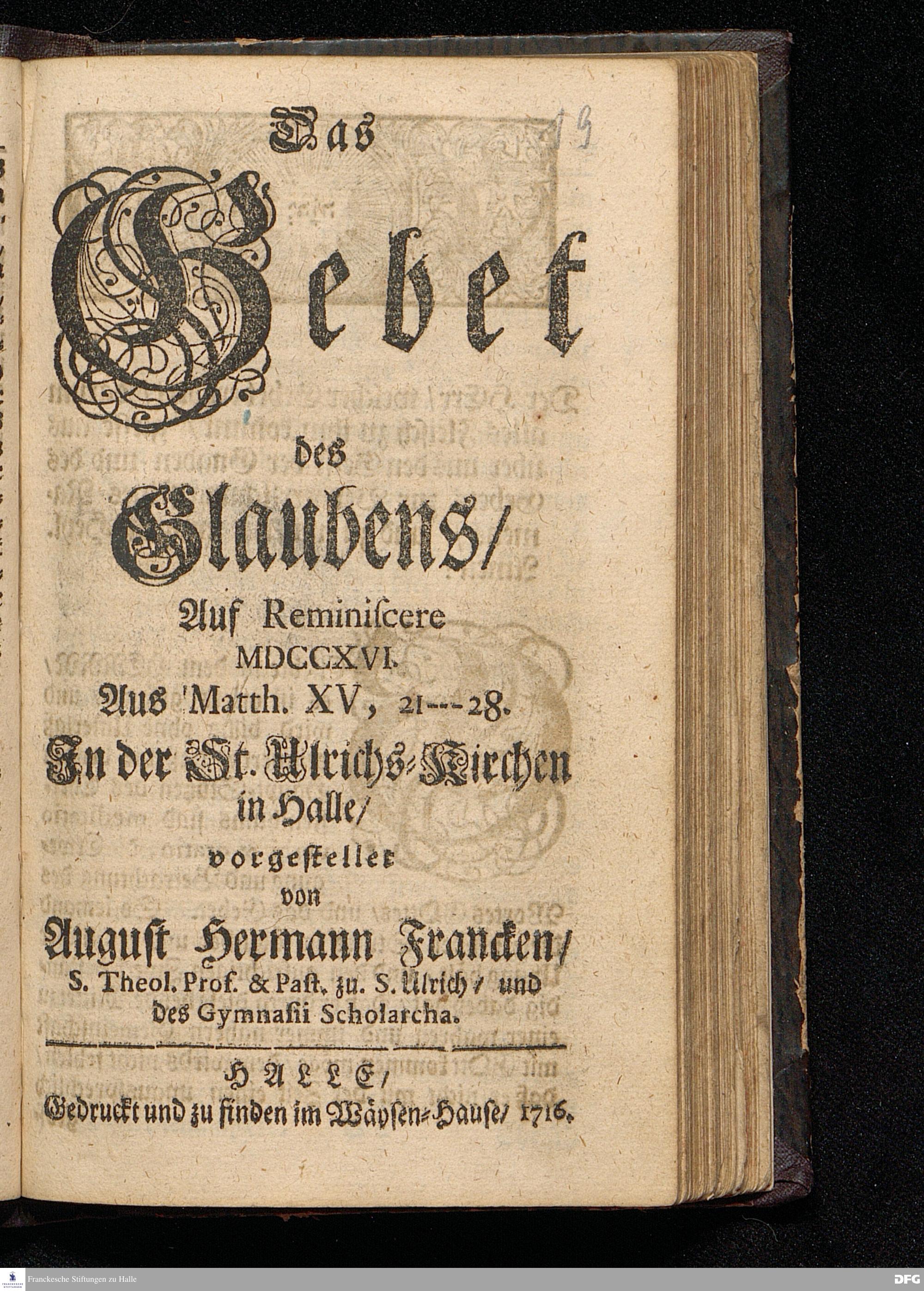 Das Gebet des Glaubens / Auf Reminiscere MDCCXVI. Aus Matth.XV, 21--28. In der St.Ulrichs=Kirchen in Halle / vorgestellet von August Hermann Francken / S.Theol.Prof.& Past.zu S.Ulrich / und des Gymnasii Scholarcha. HALLE / Gedruckt und zu finden im Wäysen=Hause / 1716.