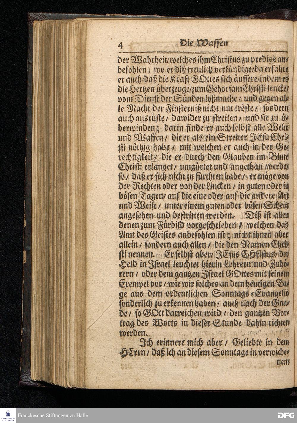 Die Waffen des Glaubens / Auf Oculi MDCCXVI. Aus Luc.XI, 14--28. In der St.Ulrichs=Kirchen in Halle vorgestellet von August Hermann Francken / S.Theol.Prof.& Past.zu S.Ulrich / und des Gymnasii Scholarcha. HALLE / Gedruckt und zu finden im Wäysen=Hause / 1716.